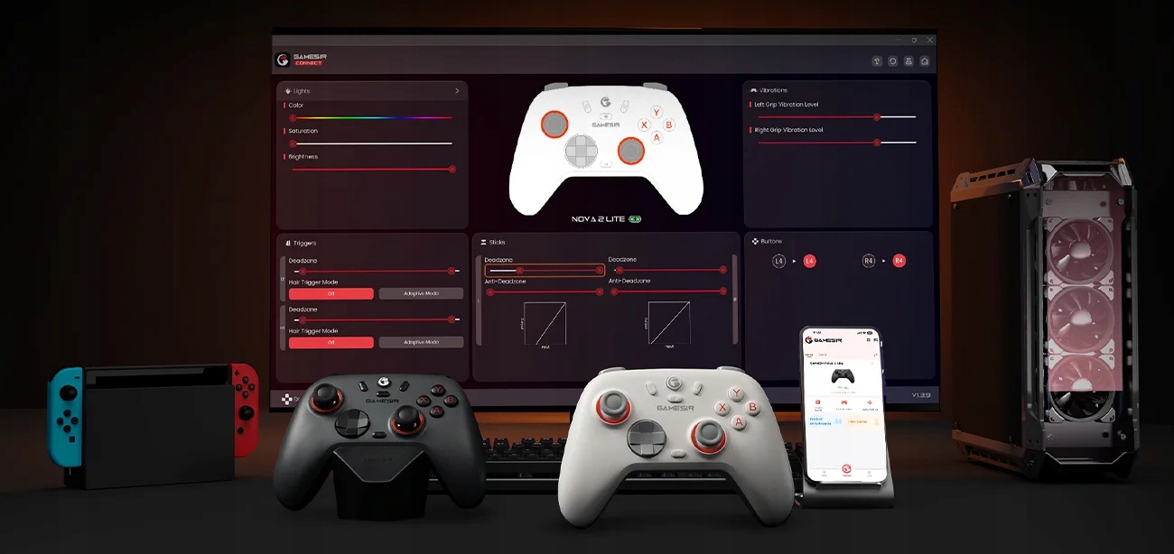 За допомогою програм GameSir Connect (ПК) і GameSir (мобільний) ви можете повністю налаштувати контролер відповідно до своїх потреб. Програмне забезпечення дозволяє, серед іншого: оновлювати мікропрограму, налаштовувати мертві зони стиків і тригерів, тестувати кнопки та регулювати силу вібрації. Деякі параметри також доступні за допомогою комбінацій клавіш, що дозволяє швидко змінювати налаштування навіть під час гри.