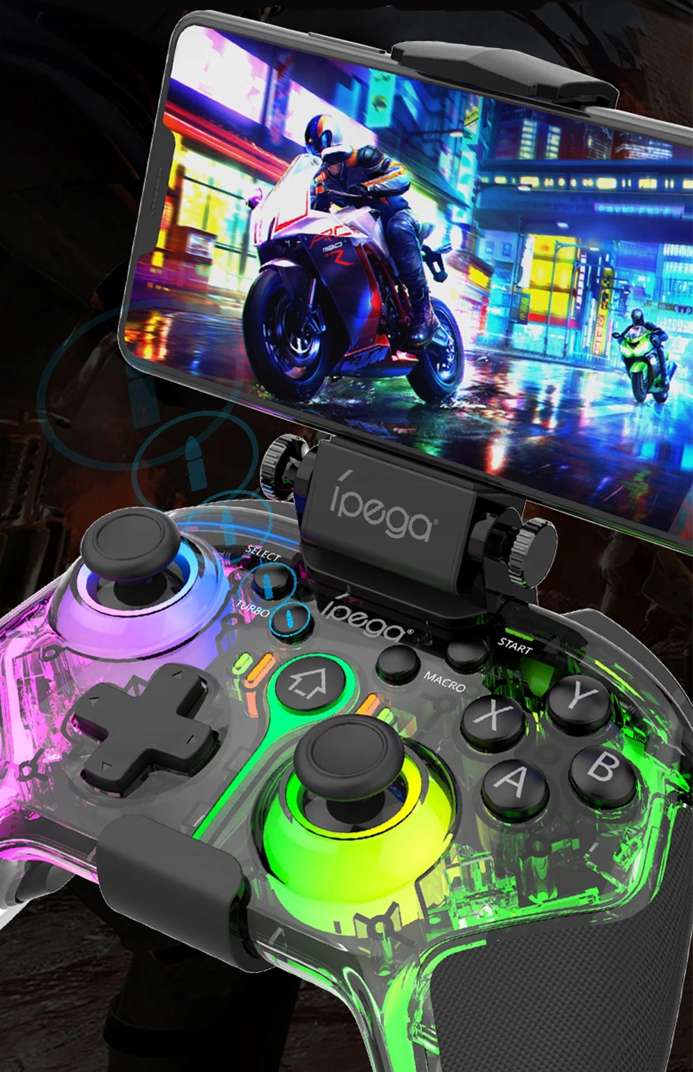 Контролер пропонує широкий спектр функцій, таких як підсвічування RGB, функція Turbo, подвійна вібрація та програмовані задні кнопки. Розсувний тримач для телефону робить його сумісним із більшістю смартфонів.