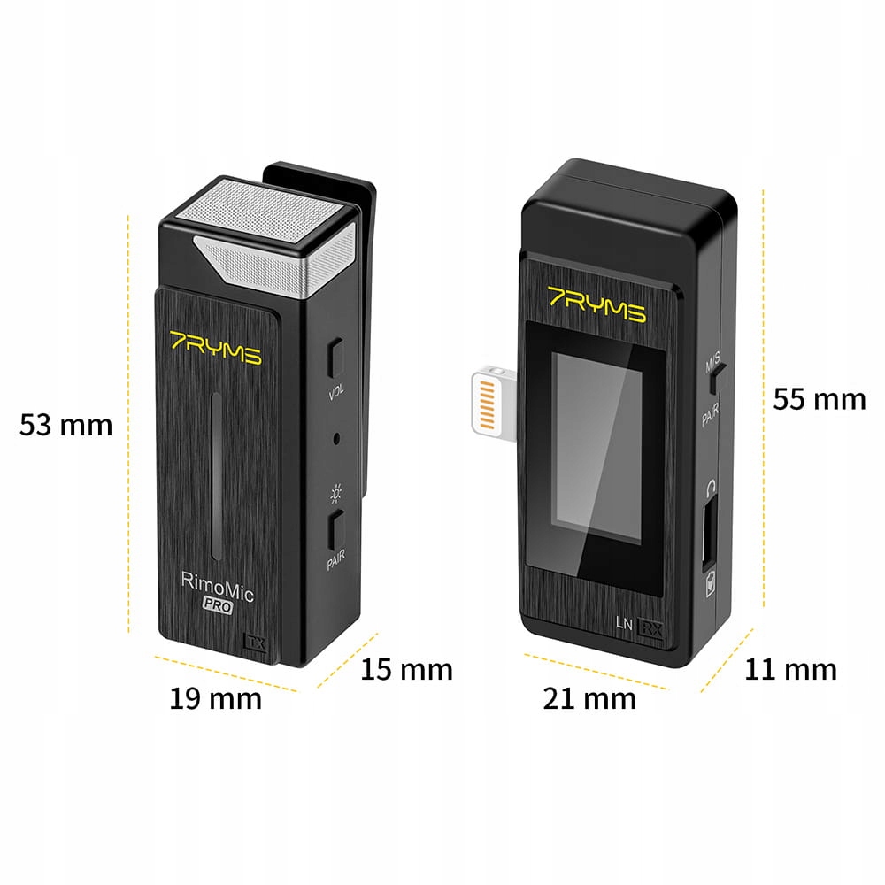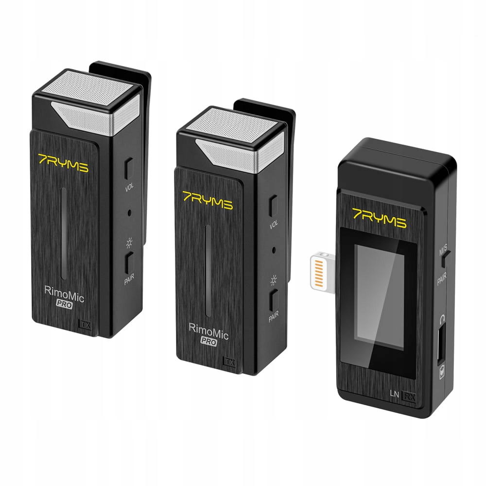 7Ryms RimoMic Pro – це набір мікропортів, призначених для пристроїв Apple iOS, таких як iPhone або iPad , яка складається з двох бездротових мікрофонів і приймача з роз'ємом Lightning. Мікрофони компактні, прості у використанні та зручні. Трансмітери мають затискачі для кріплення до блузи чи куртки та вбудовані акумулятори ємністю 95 мАг. Приймач підключається до записуючого пристрою і отримує енергію безпосередньо з нього. Мікрофони спілкуються один з одним по радіо на частотах 2,4 ГГц на відстані до 50 м (без перешкод на місцевості).