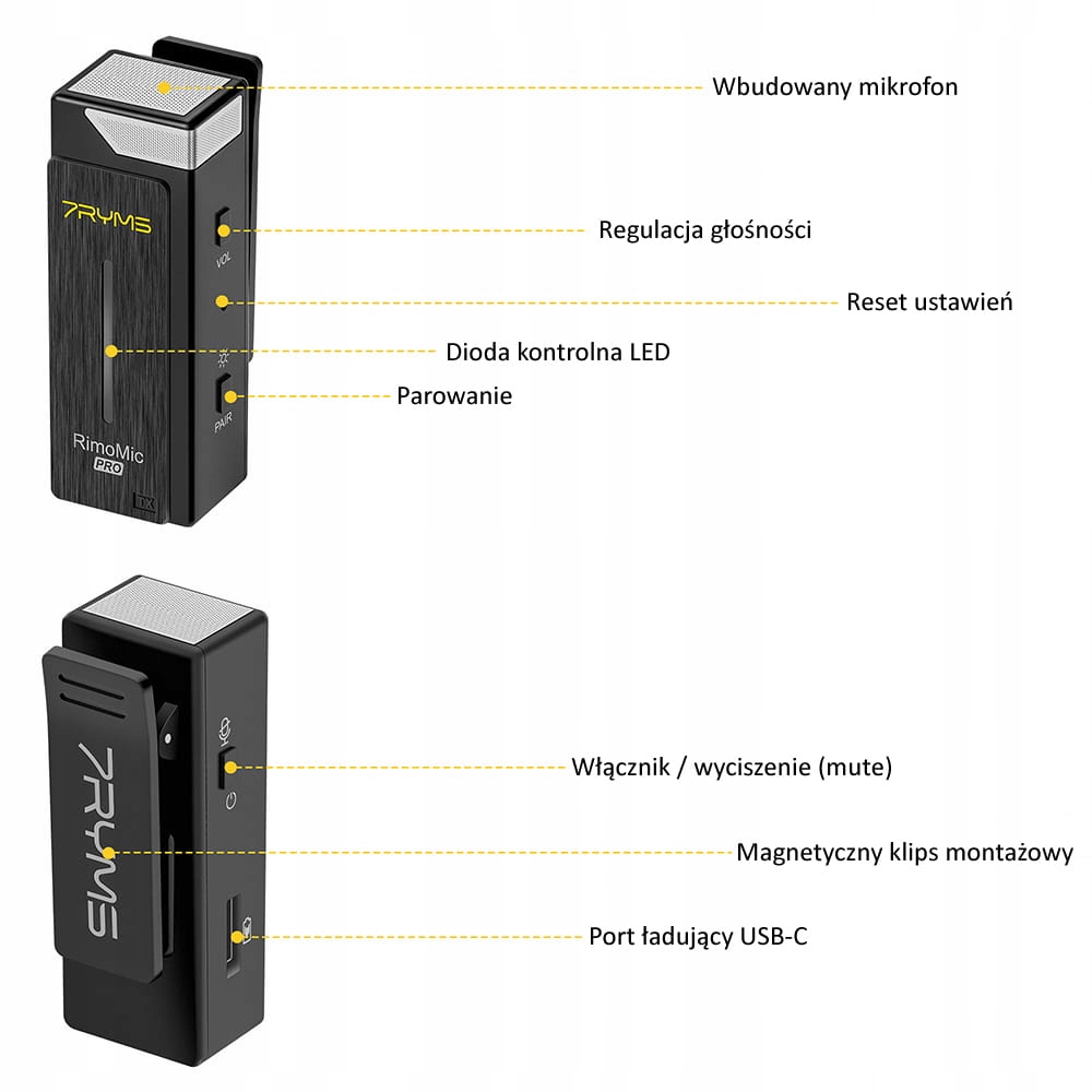 7Ryms RimoMic Pro — це набір мікропортів, призначених для пристроїв Apple iOS, таких як iPhone або iPad, який складається з двох бездротових мікрофонів і приймача з роз’ємом Lightning. Мікрофони компактні, прості у використанні та зручні. Трансмітери мають затискачі для кріплення до блузи чи куртки та вбудовані акумулятори на 95 мАг. Приймач підключається до записуючого пристрою і отримує енергію безпосередньо з нього. Мікрофони спілкуються один з одним по радіо на частоті 2,4 ГГц на відстані до 50 м (без перешкод на місцевості). RimoMic Pro має дуже низьку затримку <20 мс. Двоканальний ресивер може записувати моно або стерео трек. Він має РК-дисплей, який інформує про стан з'єднання, силу сигналу, рівень гучності та стан заряду передавача. Збоку є порт USB-C, до якого можна підключити навушники для прослуховування або підключити зарядний пристрій і одночасно заряджати iPhone під час тривалої роботи. У комплект також входить кабель USB-C - 3,5 мм mini jack, що дозволяє використовувати навушники зі штекером. Передавачі мають вбудовані всенаправлені мікрофони, контрольні діоди, що інформують про стан пристрою, кнопку регулювання гучності та перемикач. також служить кнопкою вимкнення звуку ( mute). Час роботи передавачів становить приблизно 6 годин. Для більшої зручності кліпси на передавачах магнітні - в комплект входять два круглих магніти, які полегшують кріплення мікрофонів також на одяг без комірів і лацканів. При роботі в полі ми також маємо в своєму розпорядженні два вітровики зі штучного хутра. Характеристики Двоканальний набір бездротових мікрофонів Передавачі з всеспрямованими мікрофонами Радіозв'язок 2,4 ГГц до 50 м Сумісність з пристроями Apple iOS - iPhone, iPad 4-рівнева настройка чутливості для каналів A і B Функція відключення мікрофона (в трансмітерах) Можливість підключення навушників для моніторингу звуку Вбудовані батареї 95 мАг 3,8 В Час роботи до 6 годин Зарядка через порт USB Компактні розміри: - передавач 53 × 19 × 15 мм - приймач 55 × 21 × 15 мм У комплект входить 2 × передавач TX1 × приймач RX2 × deadcat 2 лобове скло × магніт для затискачів 1 × кабель 3 × USB-C до USB-A1 × кабель USB-C – міні-роз’єм 3,5 мм (для підключення навушників) 1 × сумка – чохол Застосування Мініатюрні бездротові мікрофони для iPhone та інших пристроїв Apple із з роз’єм Lightning — чудовий вибір для інтернет-творців, які публікують матеріали в TikTok, Instagram, Facebook або YouTube. Мікрофони записують природний, чистий, якісний звук. Вони зручні у використанні, непомітні та не сковують рухів – ідеально доповнять набір для відеоблогів, проведення інтерв’ю чи бесід із запрошеними гостями.