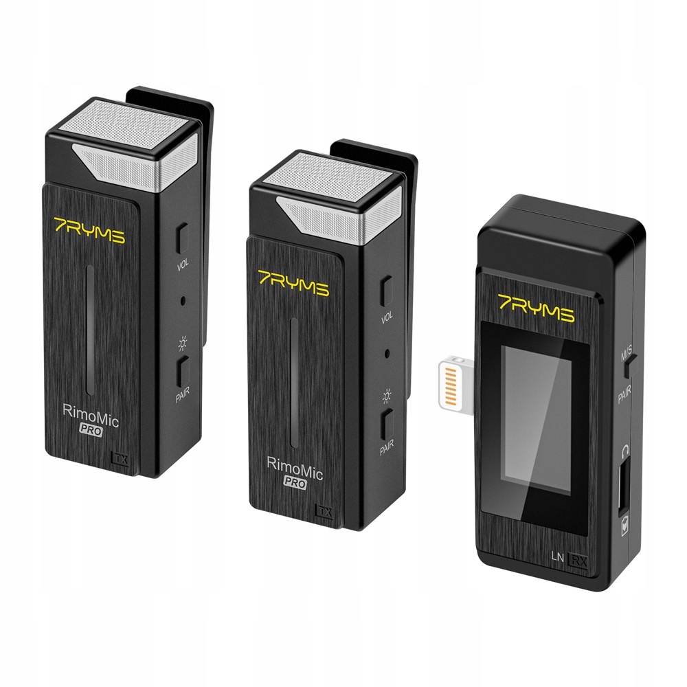 7Ryms RimoMic Pro – це набір мікропортів, призначених для пристроїв Apple iOS, таких як iPhone або iPad , яка складається з двох бездротових мікрофонів і приймача з роз'ємом Lightning. Мікрофони компактні, прості у використанні та зручні. Трансмітери мають затискачі для кріплення до блузи чи куртки та вбудовані акумулятори ємністю 95 мАг. Приймач підключається до записуючого пристрою і отримує енергію безпосередньо з нього. Мікрофони спілкуються один з одним по радіо на частотах 2,4 ГГц на відстані до 50 м (без перешкод на місцевості).