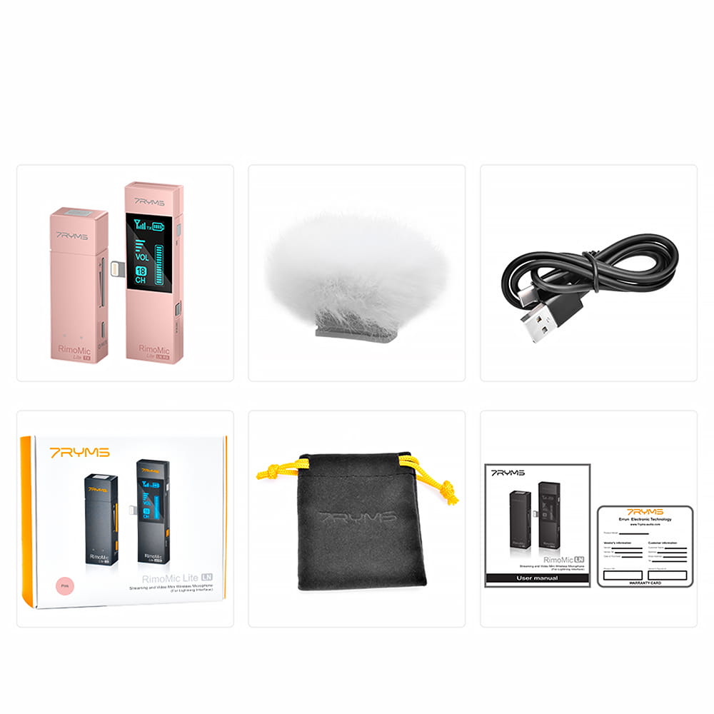 7Ryms RimoMic Lite Microport – це зручний бездротовий мікрофон із роз’ємом Lightning, призначений для смартфонів і планшетів Apple, наприклад iPhone iiPad. Набір складається з передавача з мікрофоном і вбудованим акумулятором, а також приймача, підключеного безпосередньо до звукозаписувального пристрою та живлення від нього. Мікропорти спілкуються один з одним на максимальній відстані 30 м за допомогою радіохвиль UHF (надвисока частота). Можливість вибору одного з 48 каналів забезпечує плавну передачу звуку навіть у ситуаціях, коли на екрані є інші бездротові пристрої.
