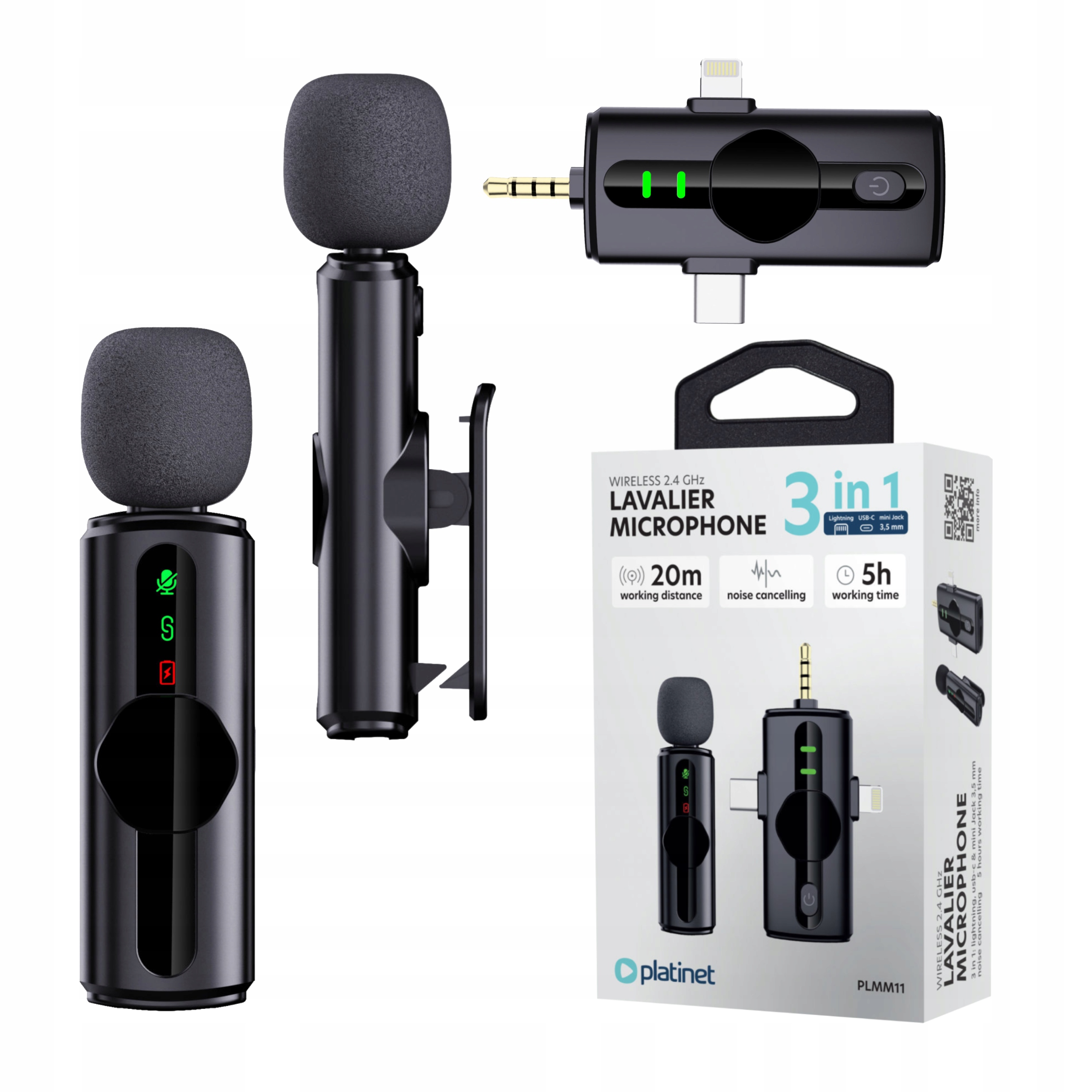 Завдяки трьом типам приймачів - Type-C, Lightning і 3,5 мм - мікрофон працює з більшістю смартфонів, камер і комп'ютерів. Незалежно від того, записуєте ви на iPhone, Android або цифрову камеру, набір працює, щойно ви його підключите. Це ідеальне рішення для людей, яким потрібен універсальний інструмент для запису в різних конфігураціях.