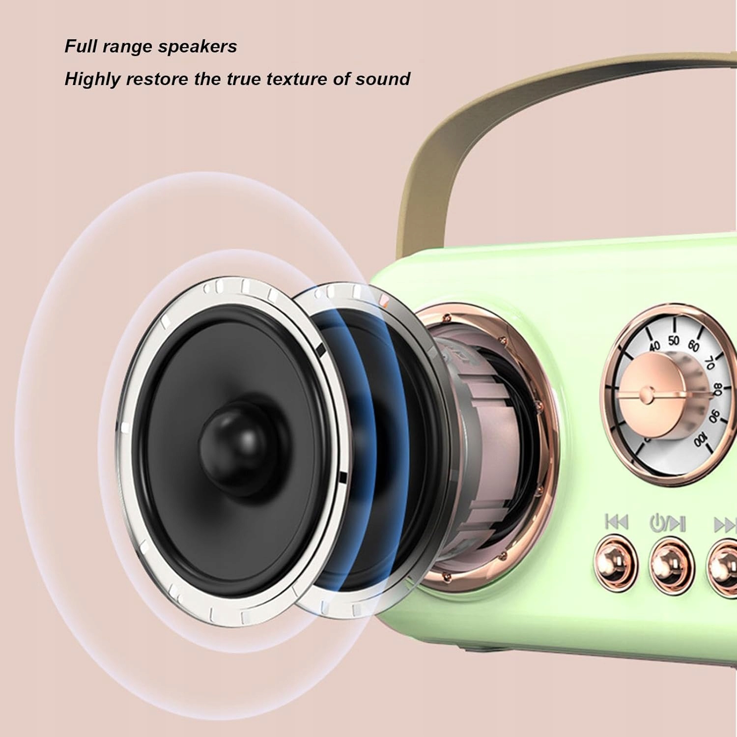 Динамік караоке використовує 40-міліметровий динамік, якість звуку HiFi, глибокі баси та об’ємне 3D-стерео, що надає текстурі музики більш реалістичну, роблячи її краще те, що приходить від музики, працює. Він оснащений мікрофоном високої роздільної здатності, який може відтворювати справжній голос, мінімізуючи навколишній шум, щоб голос завжди був правильним і чистим."