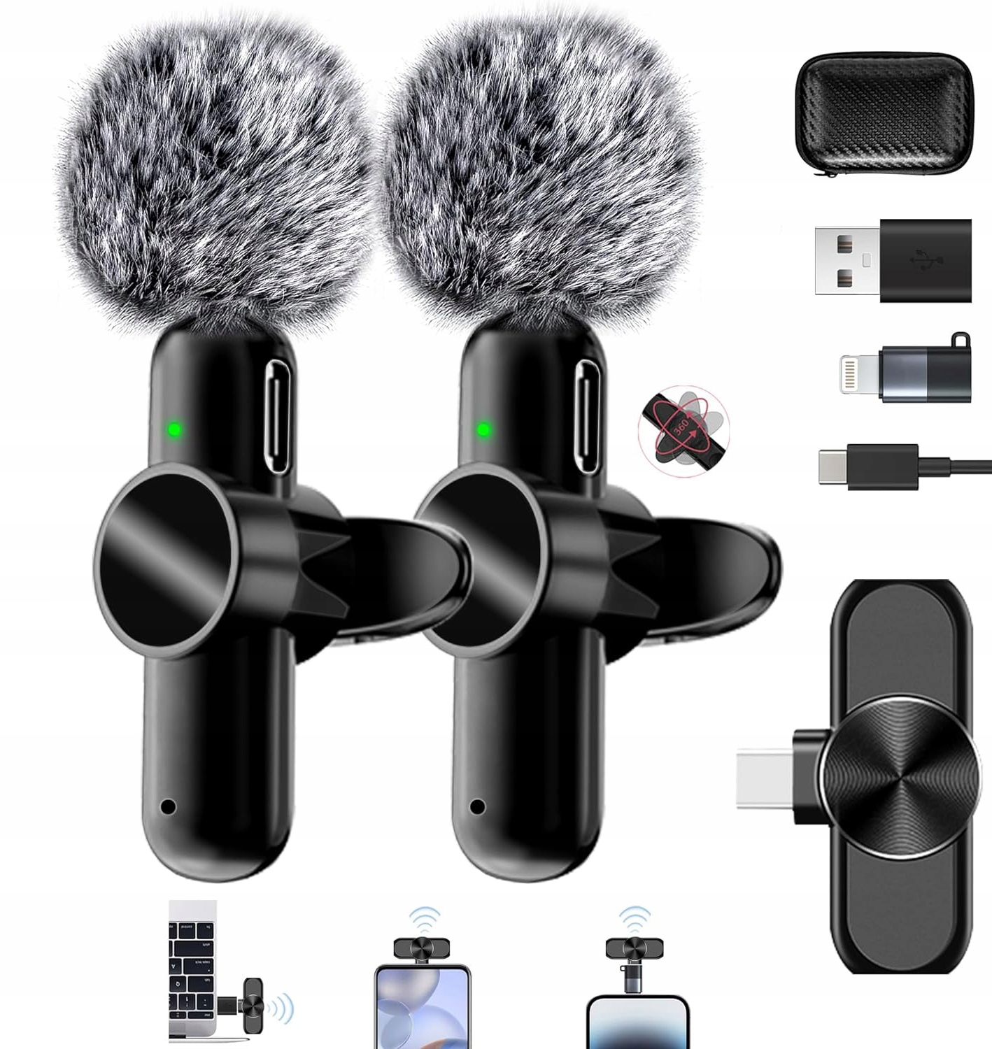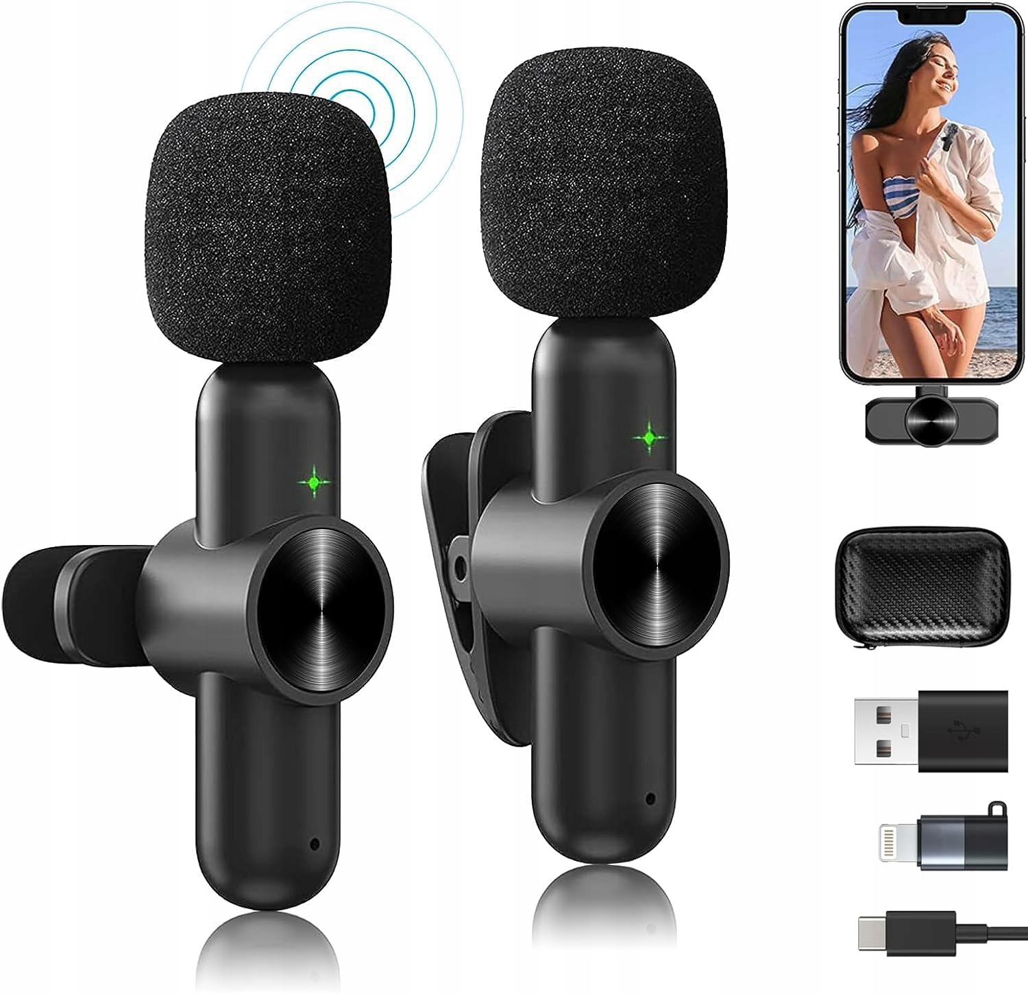 🎙️🎙️ 【Упаковка продукту】 Наші бездротові мікрофони постачаються в красивій упаковці та ідеально підходять для особистого користування чи подарунка. Ви отримаєте: 2 бездротові петличні мікрофони, 1 адаптер Type-C, 1 адаптер Type-C – Lightning, 1 адаптер Type-C – USB A, 1 кабель для заряджання, 2 вітрозахисні губки, 1 футляр для зберігання, 1 посібник користувача (англійська мова не гарантується).