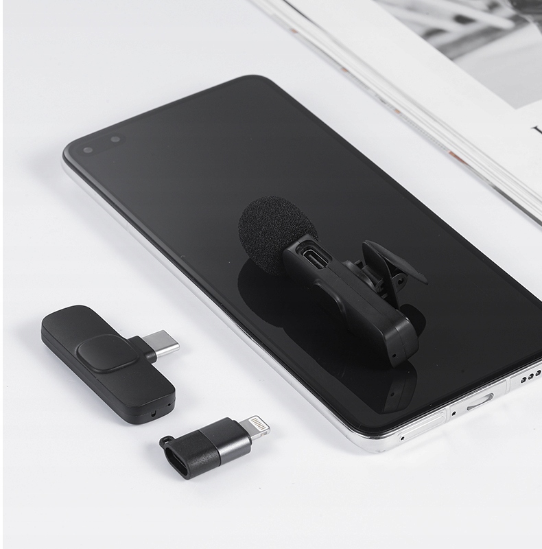 Пристрій є оснащений невеликим мікрофоном, який забезпечує непомітну та зручну передачу звуку без необхідності тримати мікрофон у руці. Під’єднайте приймач мікрофона до телефону/планшета/комп’ютера (роз’єм USB-C + адаптер Lightning).
