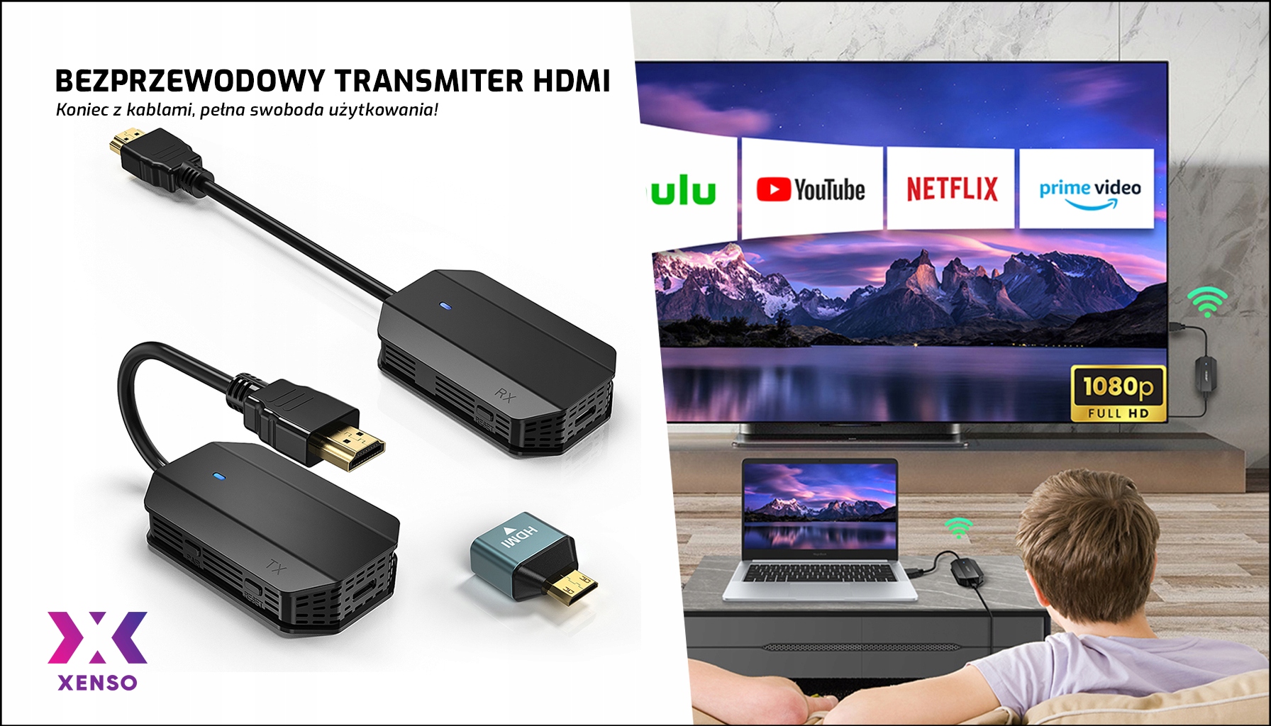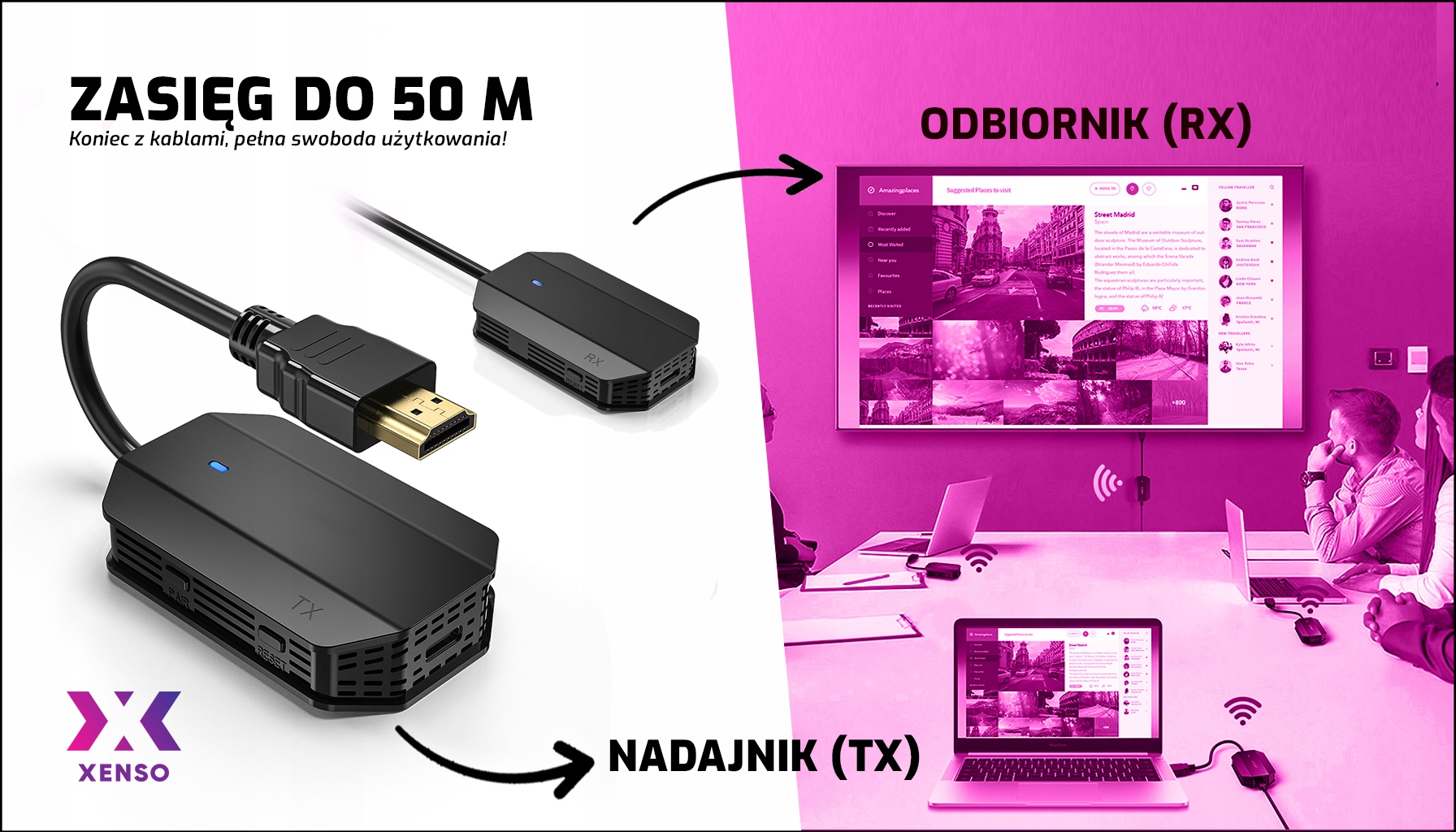 Бездротовий передавач HDMI Xenso HW99 -це інноваційне рішення, яке дозволяє надсилати аудіо-відео-сигнал у повному HD (1080p 60 Гц) до 50 метрів. Завдяки цьому ви можете підключити ноутбук, комп'ютер, консоль, декодер або смартфон з телевізором, проектором або монітором, не використовуючи кабелі HDMI.