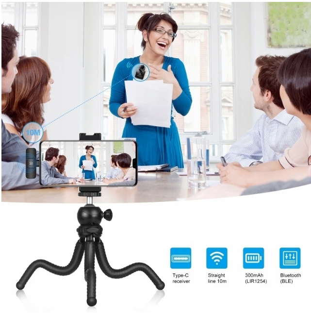 Без зайвих кабелів і підключення Bluetooth, із радіусом дії до 10 метрів і певним чистим і чистим звуком, його можна використовувати для запису інтерв’ю, відеоблогів, звітів, прямих трансляцій, презентацій, відеоконференцій тощо. Час безперервної роботи мікрофона становить до 12 годин на повністю зарядженому акумуляторі.