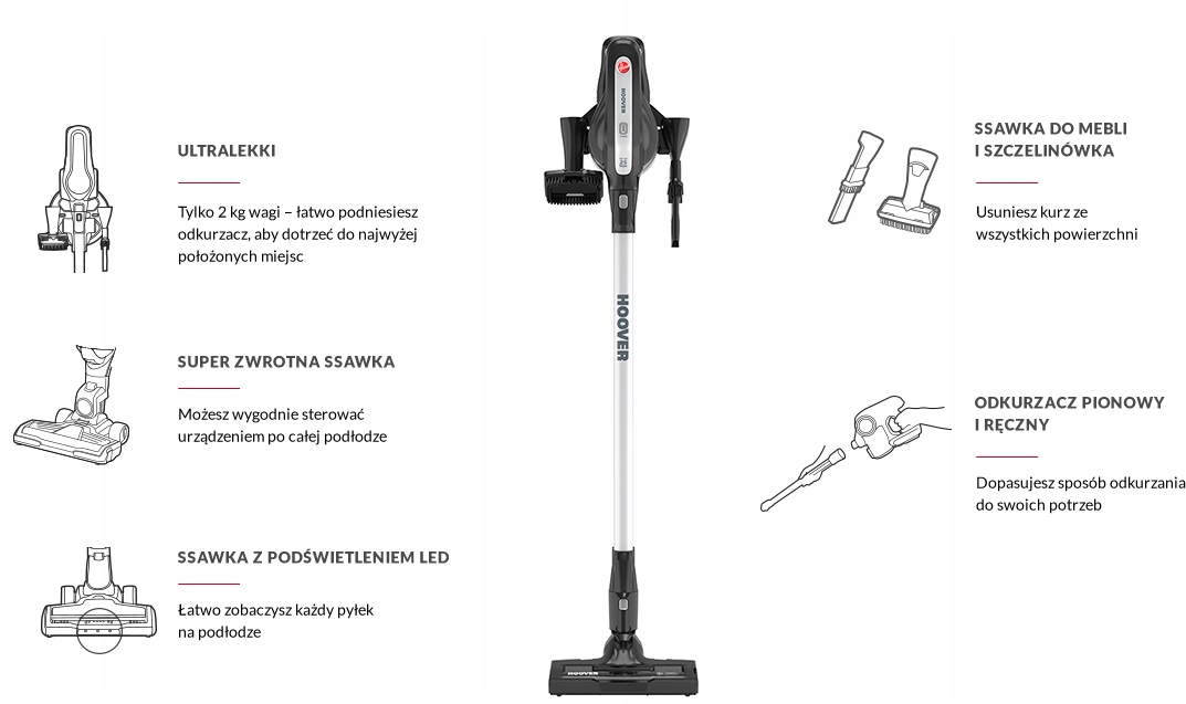 Пилосос Hoover H-Free оснащений спеціальним тримачем, завдяки якому ми можемо повісити його на стіну та зарядити акумулятор, коли він не потрібен. Цей тримач має спеціальні місця для аксесуарів для пилососа. Все це для того, щоб вони завжди були під рукою.