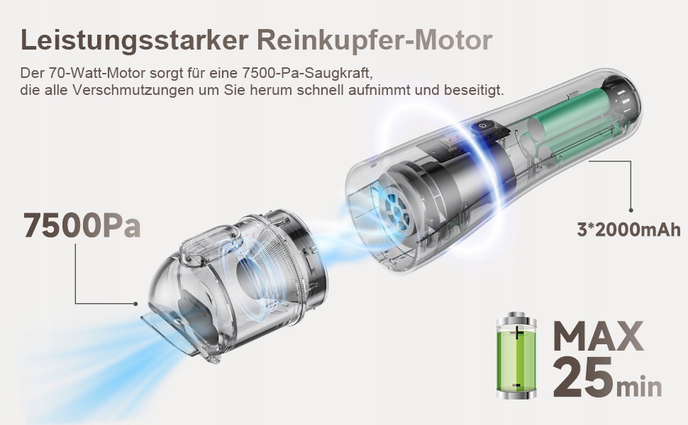 - Висока всмоктувальна потужність: Цей вазоклі вакуумний очищувач має 7500 PA Suction Power, що дозволяє йому легко поглинати будь -який тип пилу всередині автомобіля.