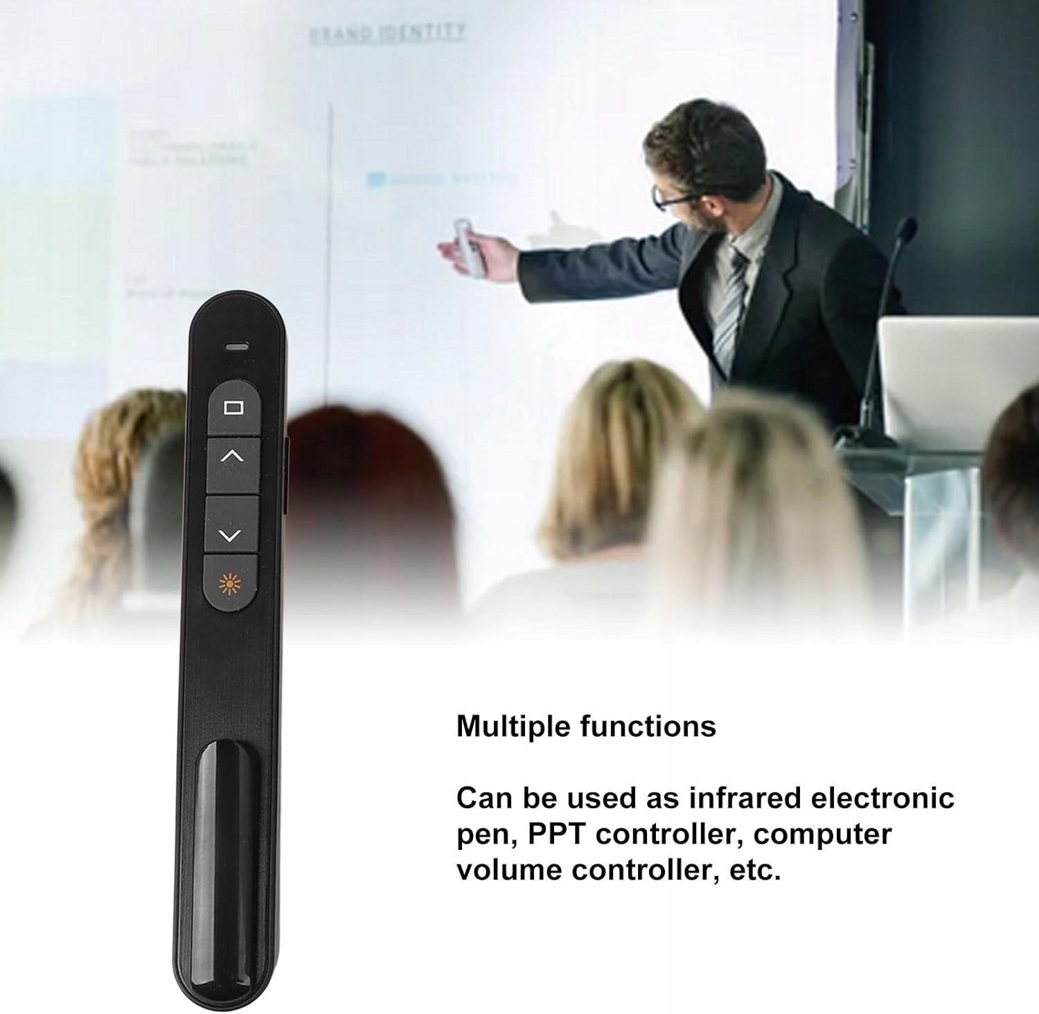 - [Кілька функцій]: Бездротовий презентер пропонує кілька функцій, слугуючи електронною інфрачервоною ручкою, контролером PPT, регулятором гучності комп’ютера тощо, забезпечуючи універсальність і сумісність.