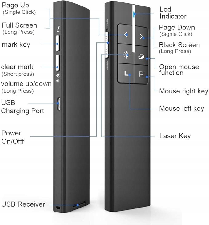 - Просте керування – > Індикатор презентації є універсальним завдяки своїм функціям: електронний знак/гумка, гіперпосилання, збільшення/зменшення гучності, перемикання/закриття вікна, відтворення/пауза медіафайлів, повний/чорний екран, сторінки/вниз тощо. ② Лазерна навігаційна миша проста у використанні, лише Plug and Play.