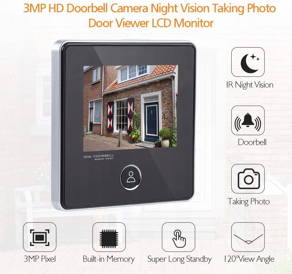 ▶ Безпека Безпека - цифровий дверний переглядач із широким кутом огляду 120°. 3-дюймовий екран показує, хто стоїть біля ваших дверей. Зображення чітке, незалежно від того, чи коридор темний, чи світлий.