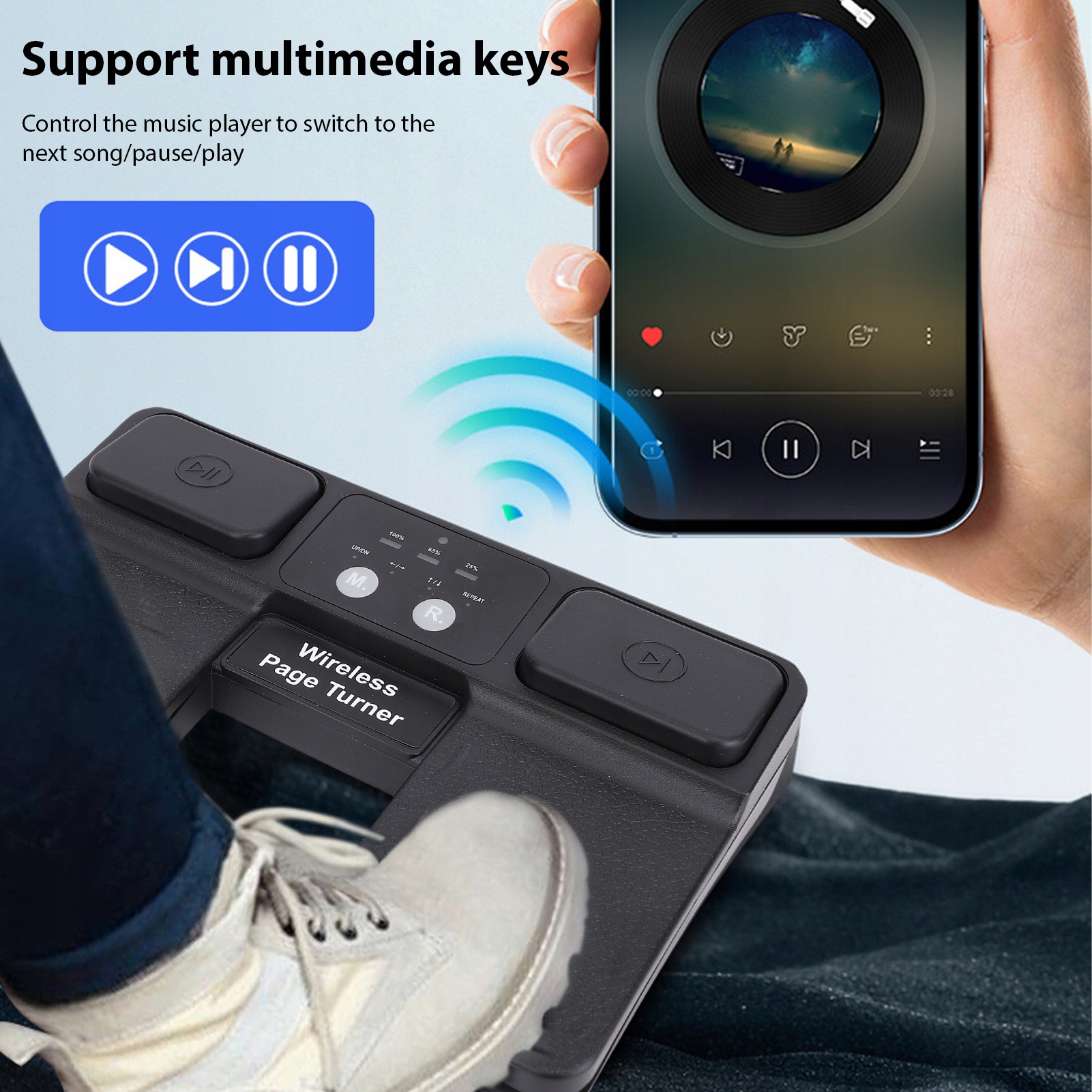 2. Багатофункціональні клавіші керування: Page Turner містить кнопки керування медіафайлами, які дозволяють легко керувати відтворенням музики. Завдяки вбудованим функціям для перемикання між піснями, призупинення та відновлення відтворення цей музичний веб-сайт Turner для планшетів покращує вашу продуктивність і навчальні сеанси.