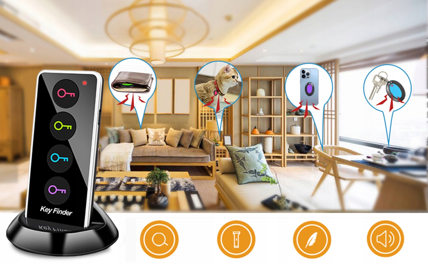 【Звук і світло】: Бездротовий радіочастотний локатор 4 в 1 робить пошук речей легшим, ніж будь-коли. Натиснувши відповідну кнопку на пульті, стежте за звуковим сигналом! Крім того, вбудоване підсвічування на пульті дистанційного керування забезпечує кращу видимість, особливо в темних місцях або вночі.