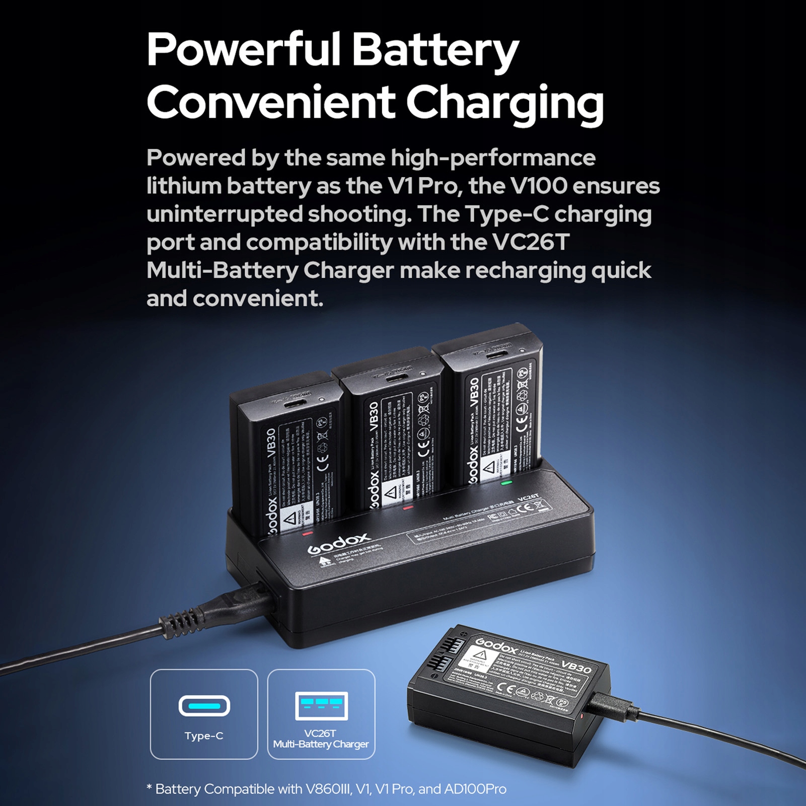 6. Повністю оновлене джерело живлення та зарядка: кругла камера спалаху з акумулятором 7,2 В 2980 мАг, який забезпечує 400 блискавок за один заряд. Швидкий і зручний зарядний порт Type-C і сумісний із багаторівневим зарядним пристроєм VC26T (не входить у комплект).