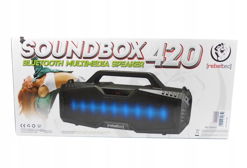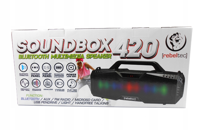 RebeltecSoundBOX 420 — це високоякісний продукт із потужністю 30 Вт RMS, розроблений для бездротового відтворення аудіо з пристроїв, оснащених модуль Bluetooth, як для планшетів, смартфонів, mp3-плеєрів або ноутбуків, додатково колонка має вбудоване FM-РАДІО та USB/microSD-кардрідер.