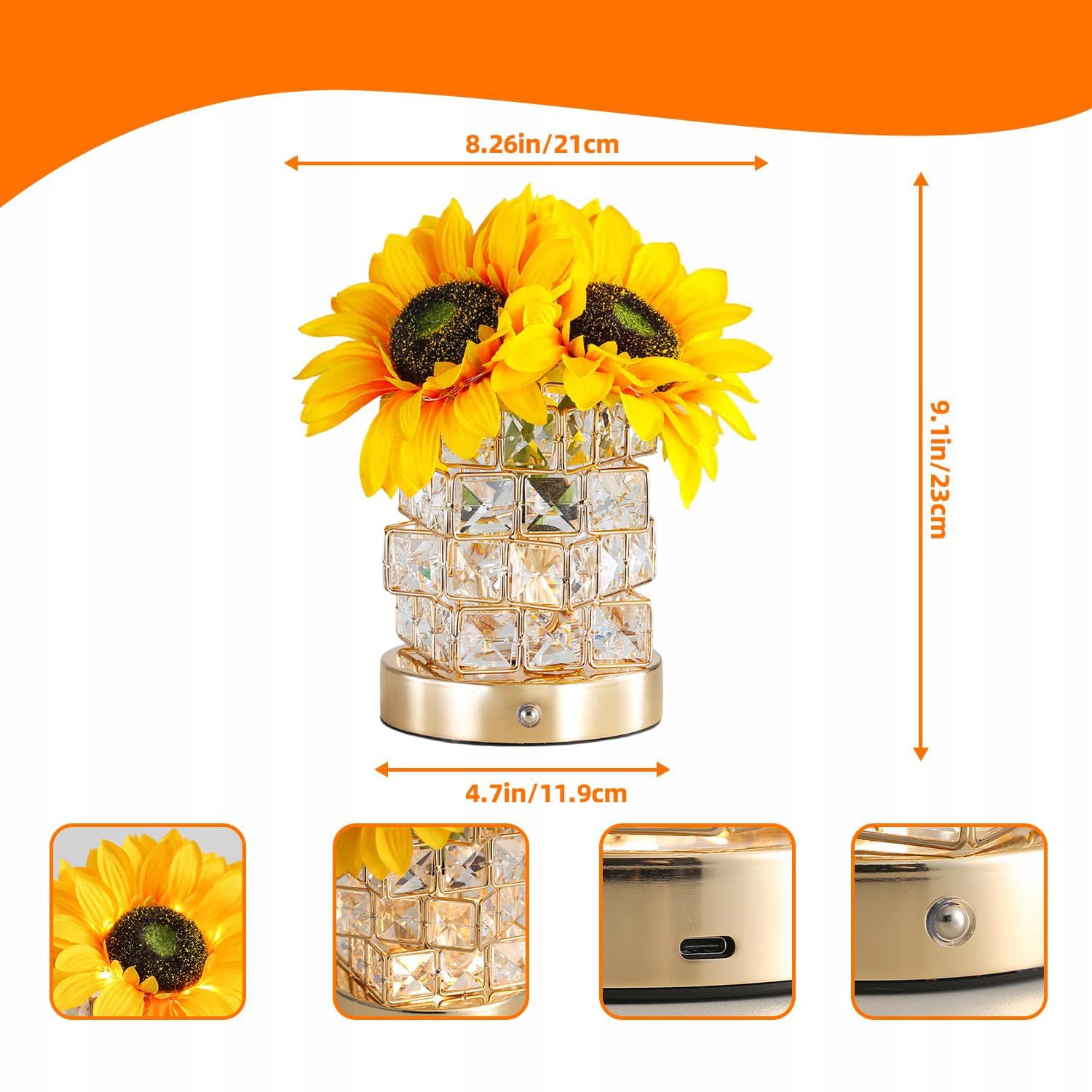 Поєднання 54 світлодіодних світильників із шовковими квітами та кришталевим квітковим горщиком, ця лампа у формі соняшнику перетворює штучні квіткові пейзажі в нове джерело світла, що дає їм нове життя. Металева основа надзвичайно міцна; Вбудований акумулятор усуває необхідність звисаючих шнурів, що дозволяє утримувати лампу в руці. Порт зарядки USB дозволяє заряджати лампу за допомогою будь -якого пристрою USB.