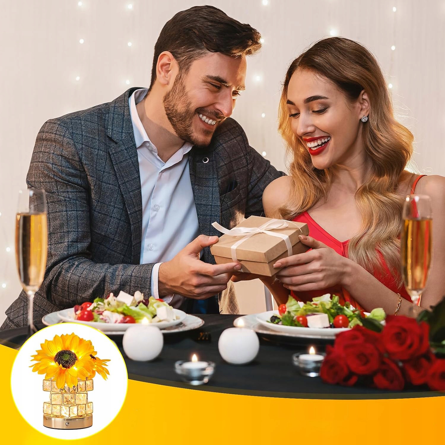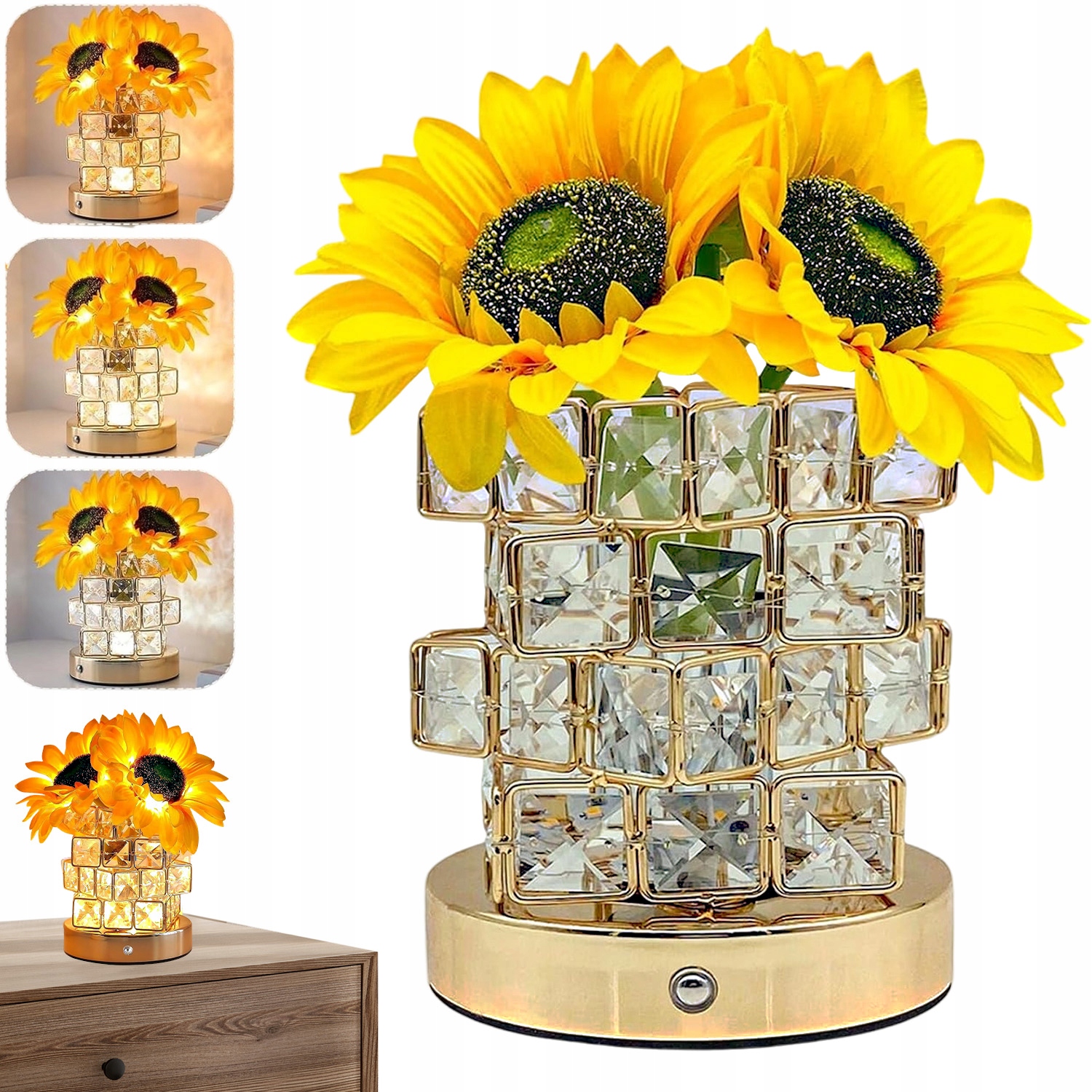 - ✔sunflowers у поєднанні з кришталевою лампою, а пелюстки виглядають особливо делікатними в цьому світлі, випромінюючи феєричне сяйво.