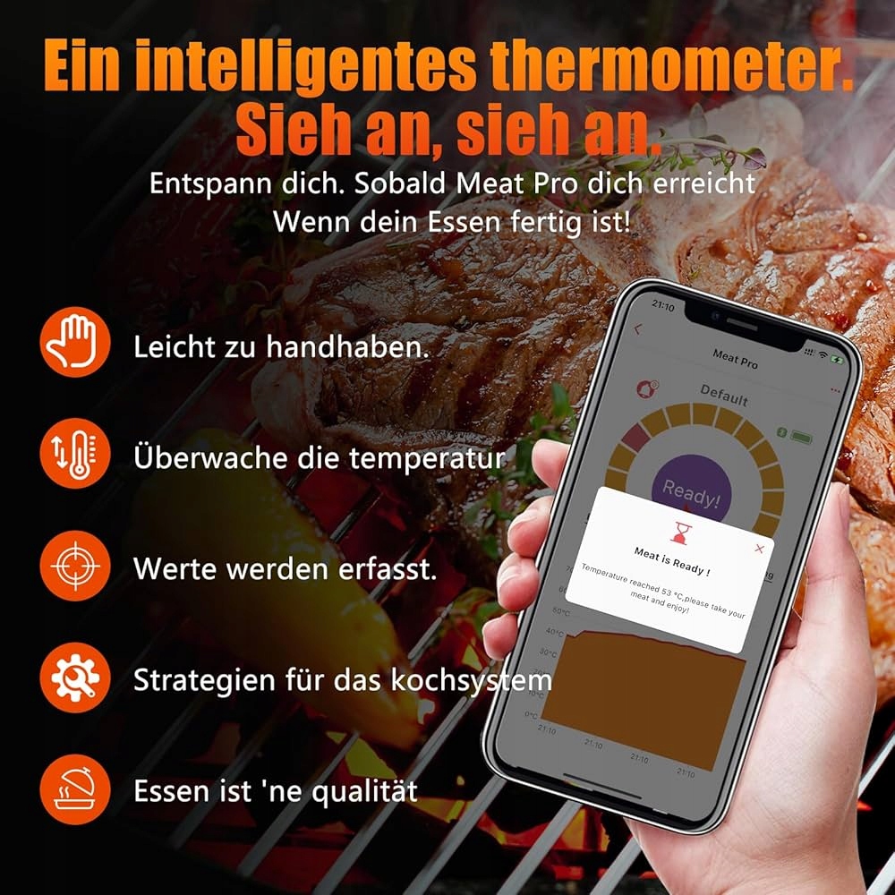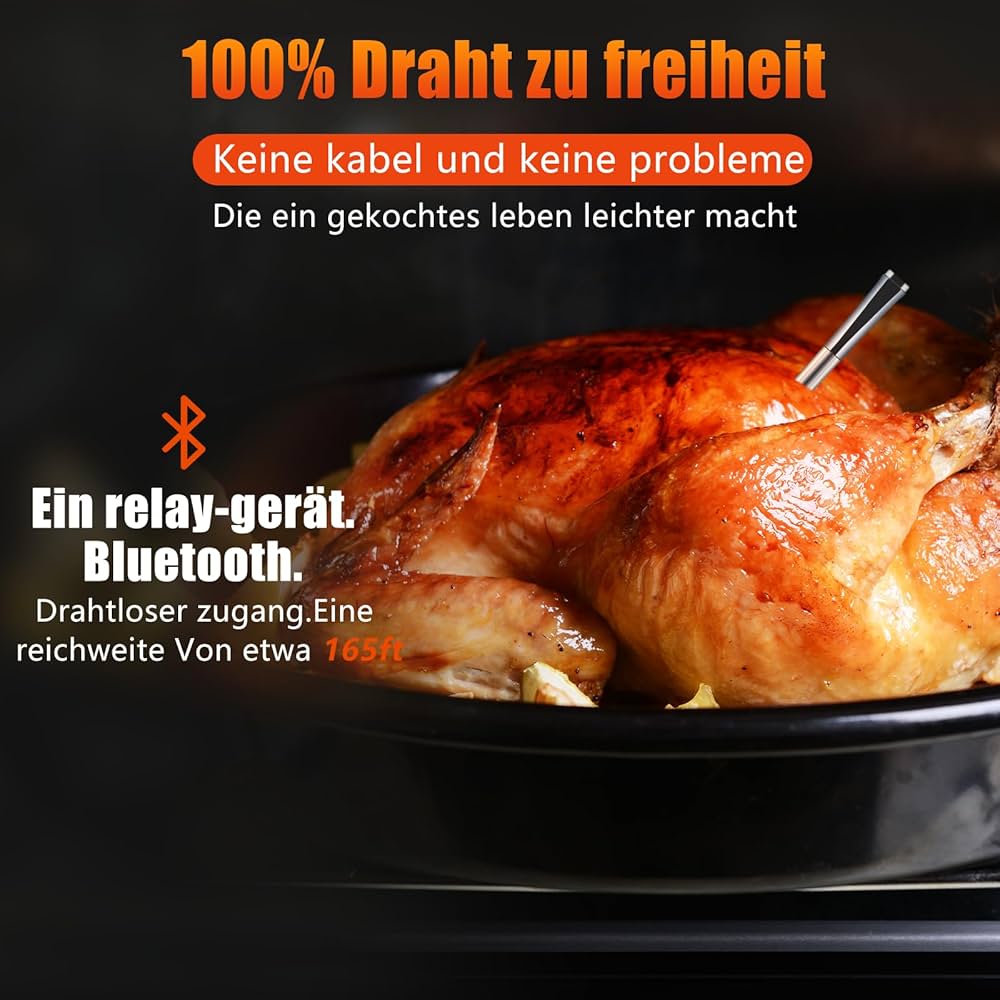 Бездротовий інтелектуальний термометр для м’яса повністю бездротовий і пропонує необмежену свободу під час приготування. Завдяки інноваційній технології цей справді бездротовий термометр для м’яса має діапазон вимірювань до 50 метрів. Ви можете легко контролювати хід приготування, підключившись до програми через Bluetooth – програма доступна як для смартфонів і планшетів iOS (версія 12.2.0 і вище), так і для Android (версія 8.0 і вище).