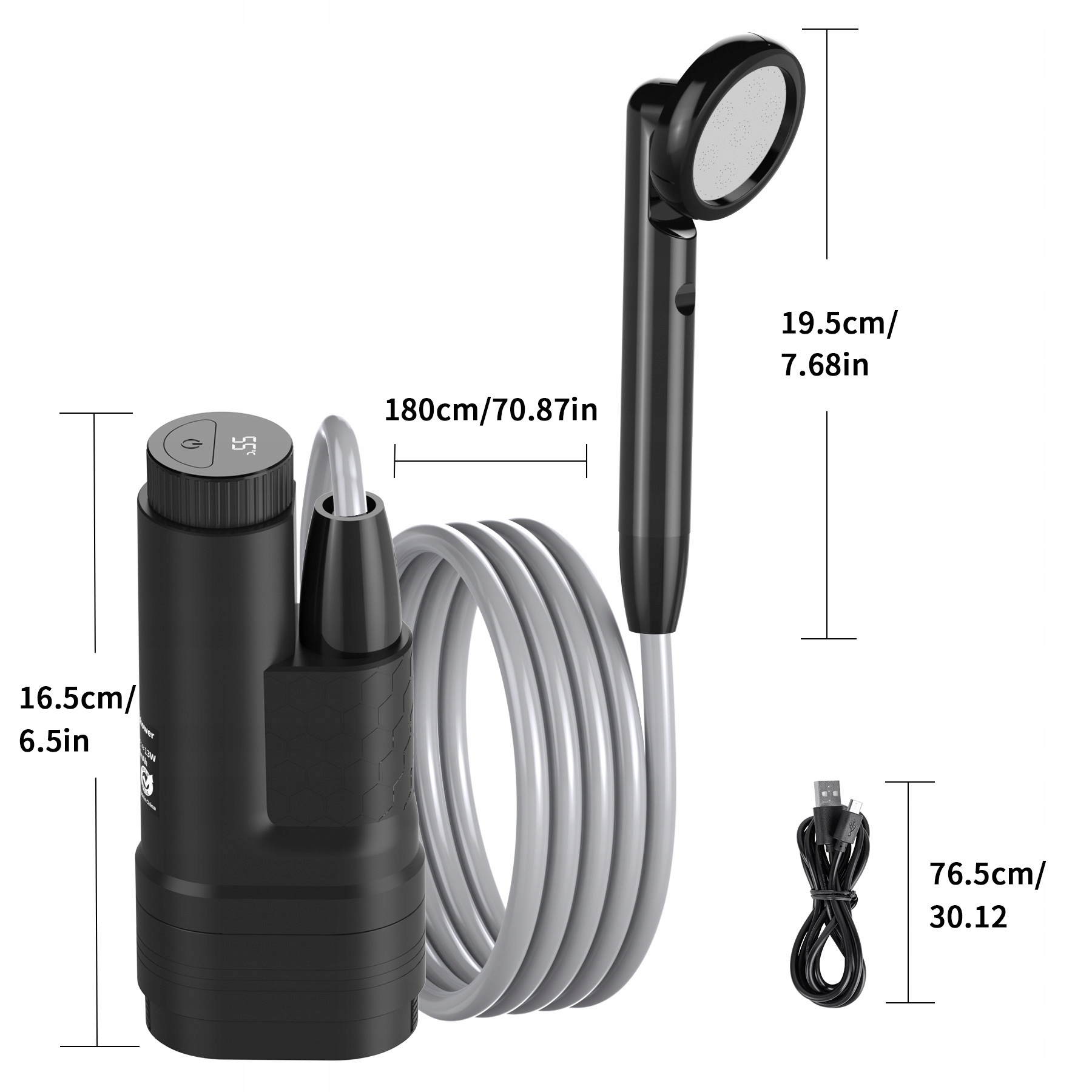 Душ має вбудований літієвий акумулятор 4000 мАг , повний заряд займає лише 5-7 годин. Його можна використовувати постійно протягом 60-90 хвилин для кількох людей під душем, зовні ви можете насолоджуватися найдосконалішим досвідом під душем. Коли акумулятор розряджається, його можна заряджати за допомогою джерела живлення автомобіля/комп'ютер/мобільний пристрій тощо за допомогою включеного кабелю зарядки USB 5 В.