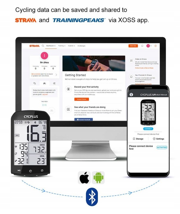 ⚡M1 не тільки одночасно записує різні дані, такі як швидкість, частота педалей, частота серцевих скорочень, потужність, пройдений маршрут, висота над рівнем моря тощо, але також підтримує швидку синхронізацію через Bluetooth і аналіз даних із додатком. - Обліковий запис Strava можна додати через програму CYCPLUS для синхронізації даних вашого велосипедного комп’ютера. Це допомагає вам контролювати дані про тренування та аналізувати параметри тренувань. (Шукайте "XOSS" у Google Play Store або Apple App Store, щоб завантажити програму)