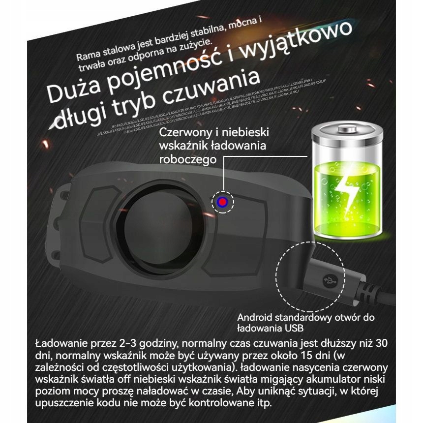 Сфера застосування: велосипеди, мотоцикли, домашні двері та анти -крадіжні вікна та інші вібрації, що викликають тривоги; Зарядка протягом 2-3 годин, звичайний режим очікування протягом понад 30 днів, нормальне використання протягом приблизно 15 днів (залежно від частоти використання), коли акумулятор поганий, заряджайте його вчасно, щоб уникнути неконтрольованих ситуацій, один хост може бути пристосований до 5 пілотів дистанційного керування, і один пульт дистанційного керування може контролювати багато хостів одночасно. За замовчуванням це пілот від 1 до 1. Він повинен бути пристосований, щоб навчитися контролювати один на століття.