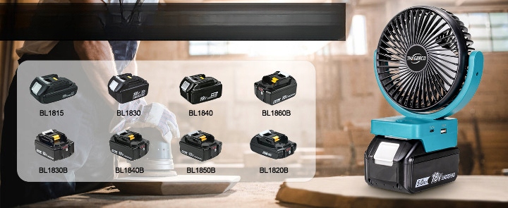 Ідеальна сумісність: Наш акумуляторний вентилятор для кемпінгу працює з літій-іонними акумуляторами Makita 18 В. Підключіть свої акумулятори (BL1860, BL1850, BL1840, BL1830 тощо) .), щоб насолоджуватися прохолодою в будь-який час і в будь-якому місці. Примітка. Якщо вентилятор не використовується, від’єднайте його від акумулятора, щоб уникнути надмірного розряджання акумулятора.