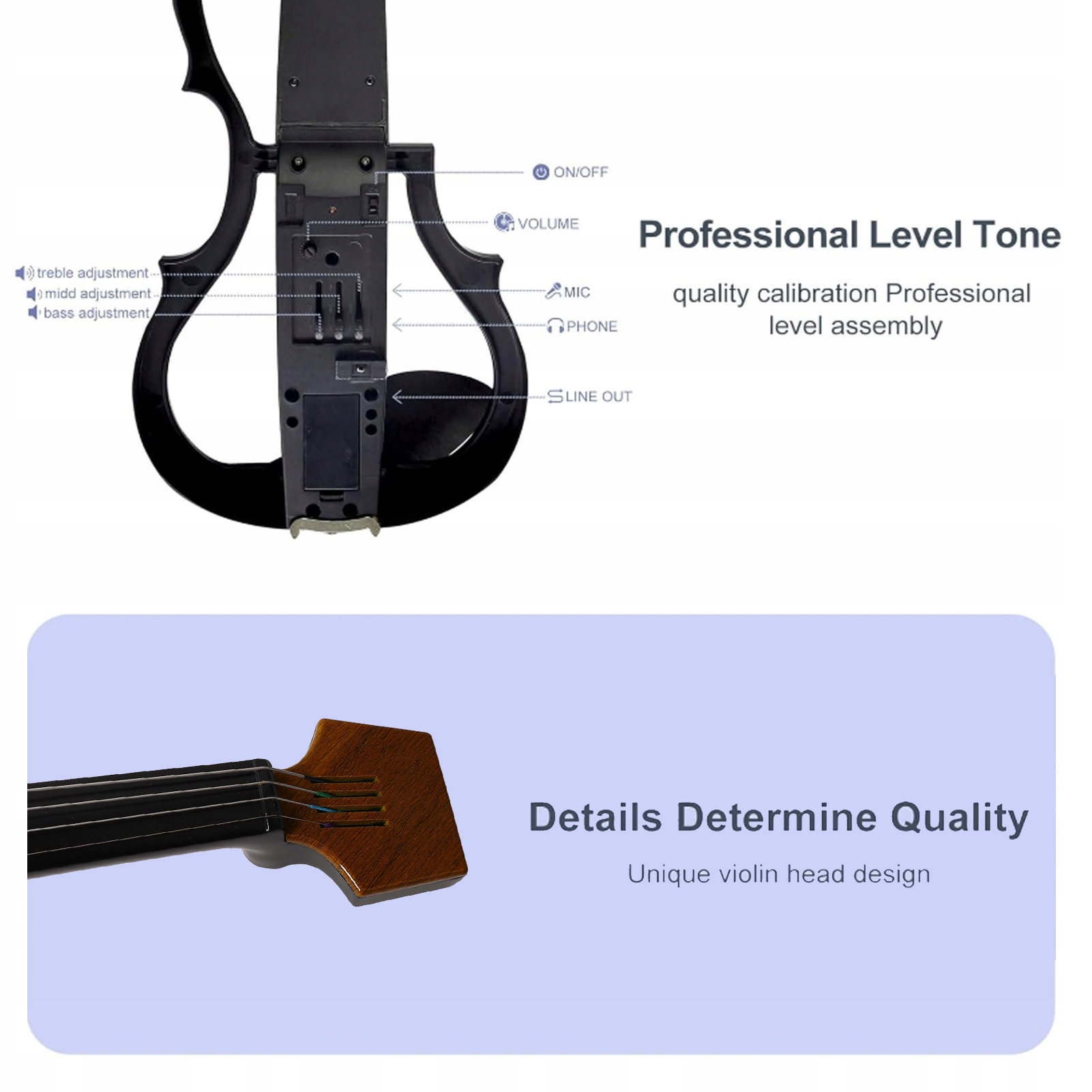 5. Багатофункціональність: ця безголова електрична скрипка повністю функціональна, її можна під’єднати до підсилювача та MP3-акомпанементу, поставляється з навушниками, підключеними до телефонного гнізда, і оснащена прийомом DV 10B із регульованими низькими, середніми та високими тонами для захоплення чутливих і тонких звуків.