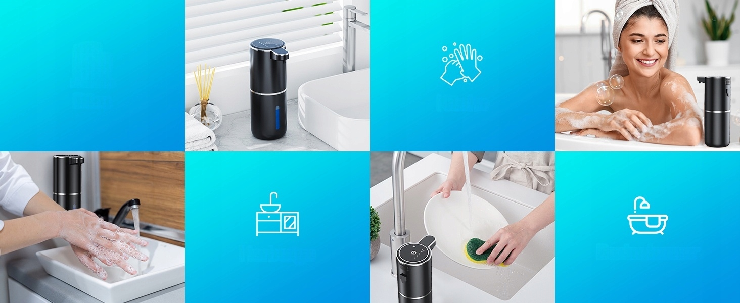 Інтелектуальний дисплей: Після додавання гель для очищення у воду в пропорції близько 1: 3, дозатор мила автоматично виробляє товсту товсту піну. Натиснувши кнопку вгорі, ви можете вибрати один із чотирьох різних рівнів піни, що полегшує регулювання кількості піни на індивідуальні потреби.