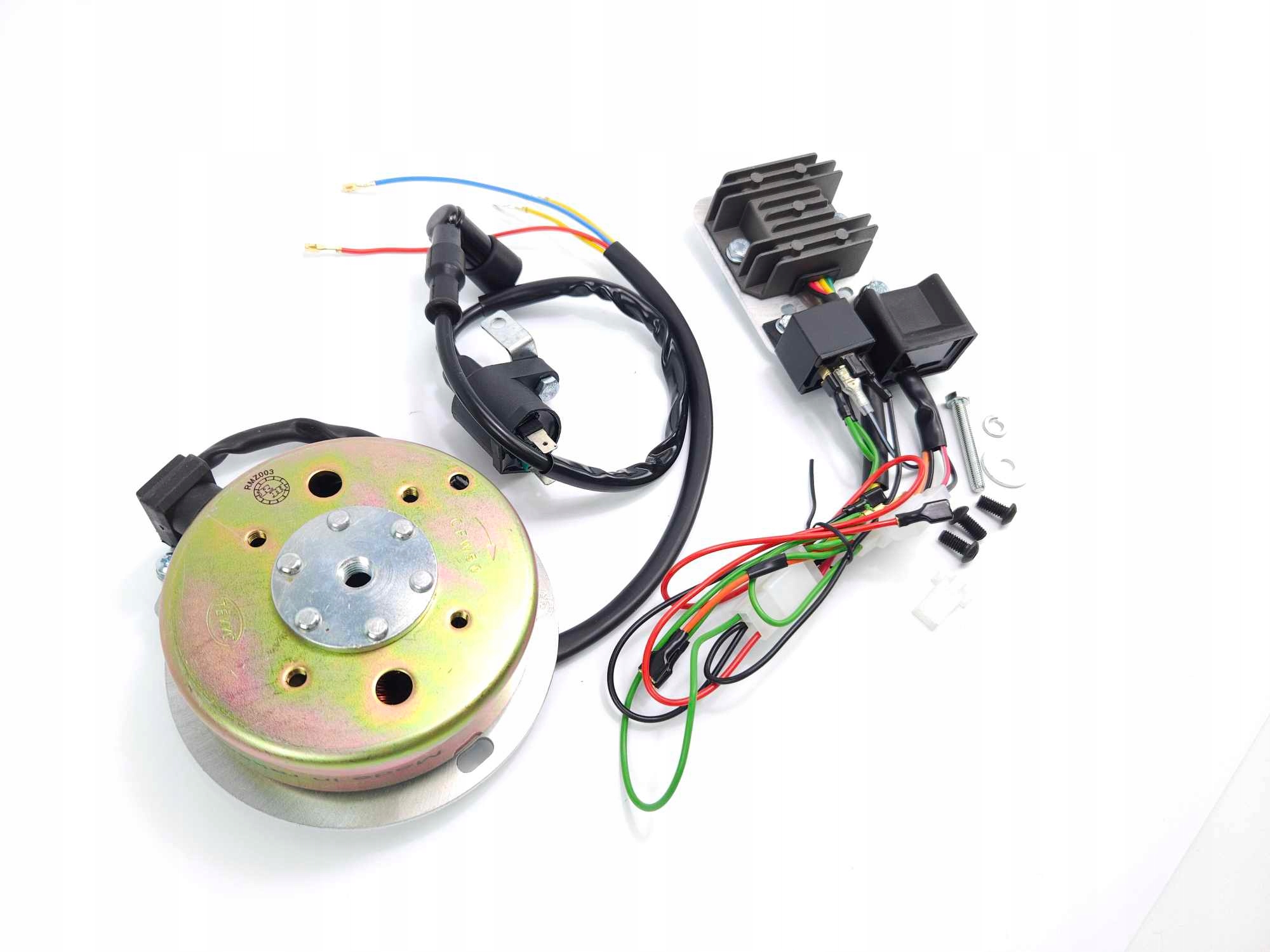 Декілька слів про виготовлення окремих елементів набору: 1. Основа - вирізана лазером з алюмінію товщиною 4 мм, сконструйована таким чином, що вона підходить замість оригінального генератора. модифікації (загвинчуються 3 гвинтами, що входять в комплект) інтегровані з датчиком пульсу, розміщеним на основі таким чином, що регулювання кута випередження запалювання відбувається швидко і зручно. Статор, розміщений на основі та піднятий спеціально підготовленими гільзами, гарантує відповідну відстань котушок від магнітів (відповідне розташування котушок у магнітному полі підвищує ККД генератора). Статор перероблений на безмасовий, оснащений хорошими кабелями з роз'ємами для монтажних кубів (єдине таке рішення на ринку!), кабелі захищені нейлоновою опліткою.