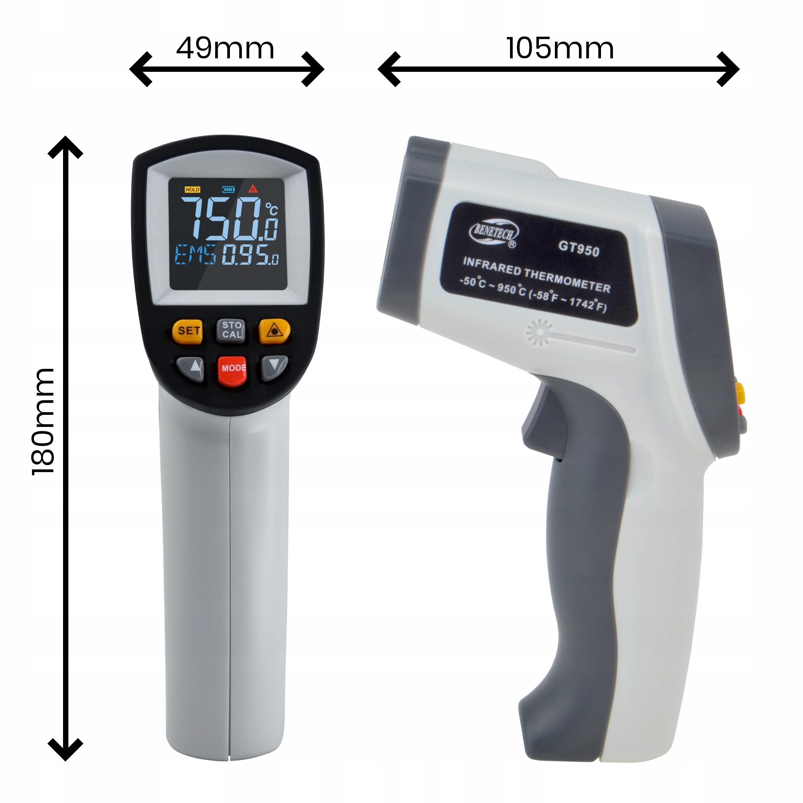 ПІРОМЕТР, БЕЗКОНТАКТНИЙ ЛАЗЕРНИЙ ТЕРМОМЕТР -50 +750 BENETECH GT750 + батарея VARTA