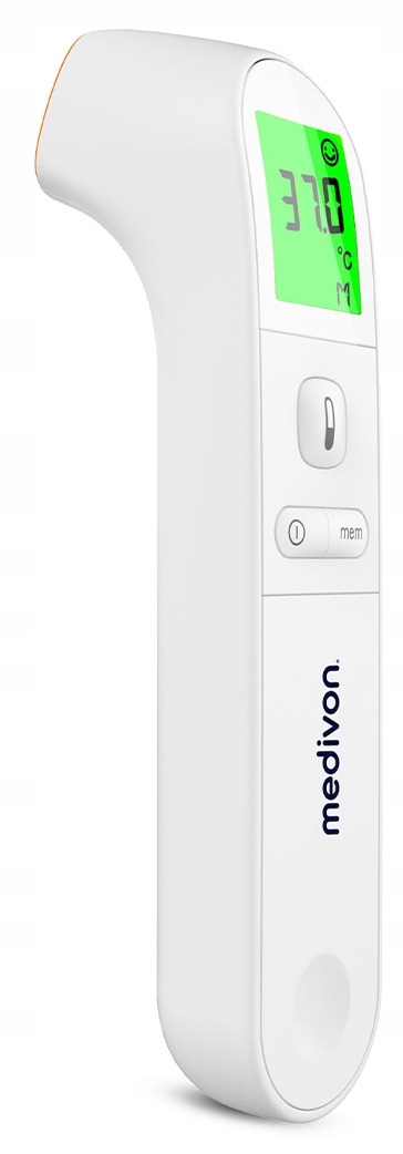 Безконтактний термометр MEDIVON дозволяє проводити безконтактні вимірювання температури як тіла, так і предметів. Це означає, що ви можете перевірити температуру хворої дитини та переконатися, що молоко дитини в пляшечці не надто гаряче. Інфрачервона технологія забезпечує точність вимірювання, яке відбувається безшумно, з відстані кількох сантиметрів. Не вимагає калібрування. Чіткий дисплей з підсвічуванням показує результат вимірювання в одиницях °C і °F. Функція запам'ятовування останніх 9 вимірювань особливо корисна під час хвороби, коли важливо стежити і порівнювати температуру.
