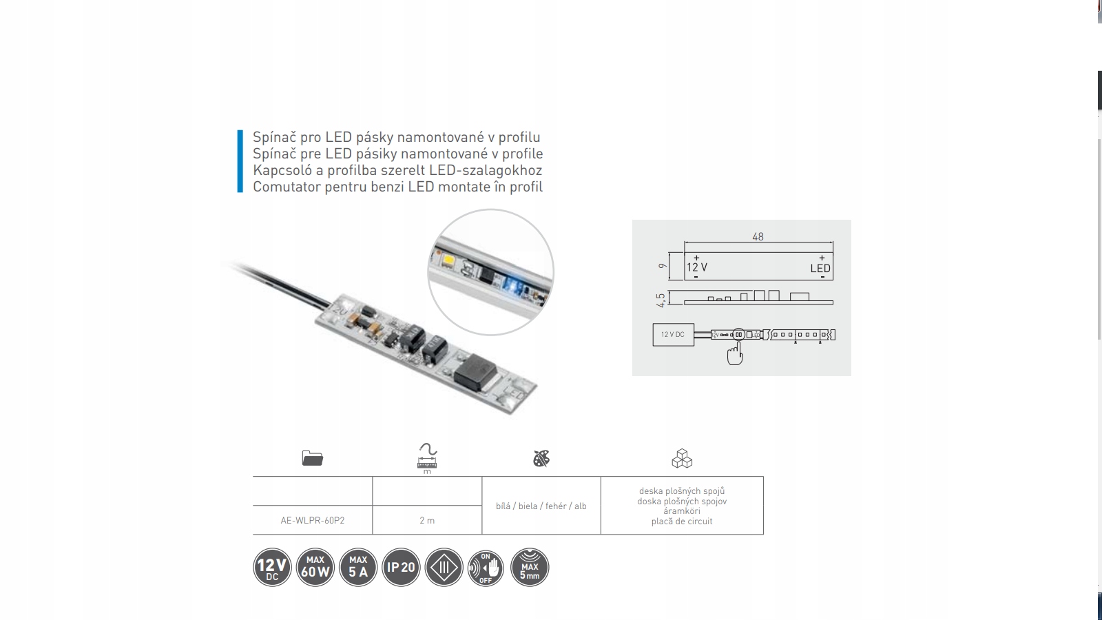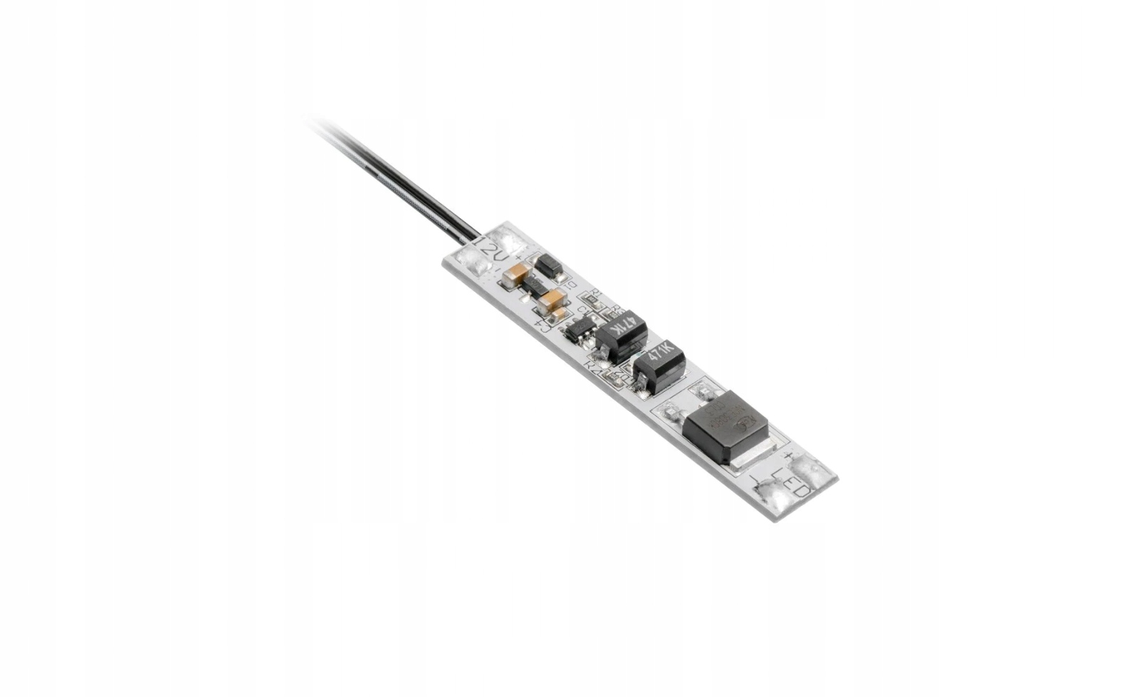 Безконтактний перемикач для монтажу всередині профілю. Підтримує стрічкові ділянки потужністю не більше 60 Вт. Немає функції затемнення. Про готовність до роботи свідчить синій світлодіод. Це також полегшує пошук перемикача вночі. Не підключайте вимикач під напругою. Перший запуск слід виконувати з кришкою.