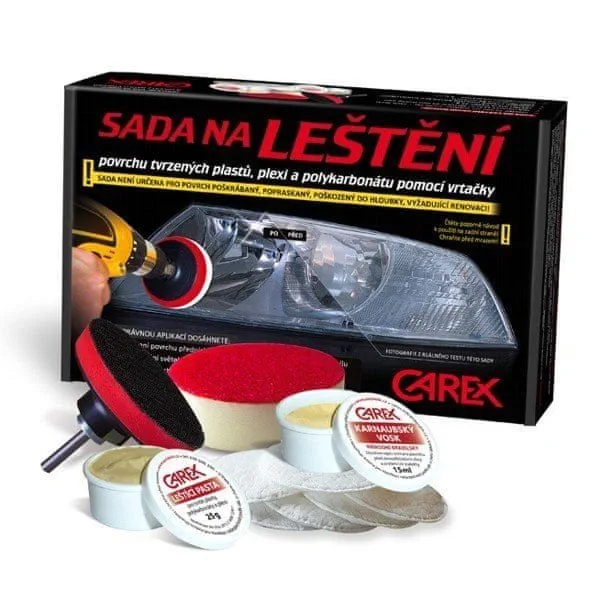 До складу набору для полірування та захисту поверхні фар входять: (75 мм), пінопластовий полірувальний диск (85 мм), 2 наждачні папери (P 1500 і P 2000), 6 аплікаторів для тонкого полірування, полірувальна паста CAREX (25 г) і справжній бразильський віск. Карнауба (15 мл).