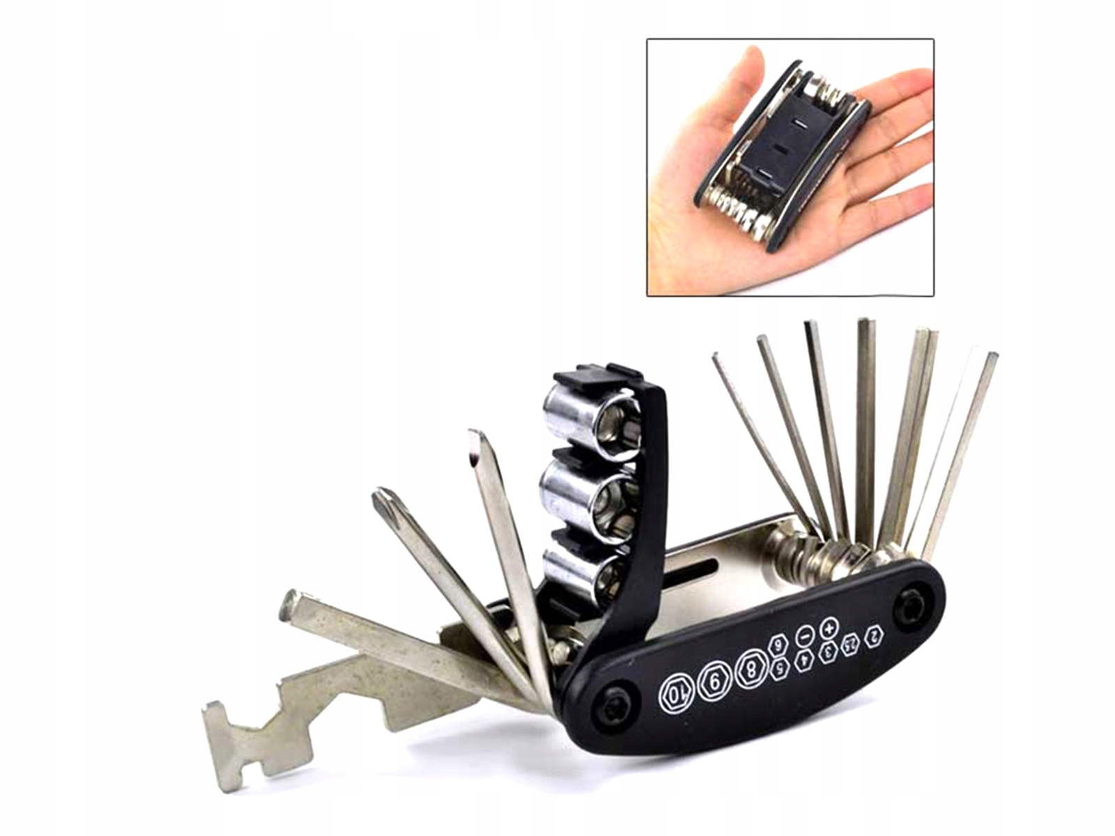 Набір ключів від велосипедів! Дуже практичний і компактний гаджет для кожного пристрасного велосипедиста. Відтепер ви можете виконувати будь-який дрібний ремонт велосипеда в дорозі, не возячи окремо з десяток інструментів! У набір входить 16 інструментів для обслуговування та дрібного ремонту велосипеда. Все це було укладено в зручний і компактний кишеньковий ніж. У складеному вигляді він легко поміщається в руці, легко зберігається і не займає багато місця в велобузі або багажнику. У набір входять шестигранні ключі, викрутки, розетки з перехідником, ріжкові ключі та спеціальний спицевий ключ 14GE.