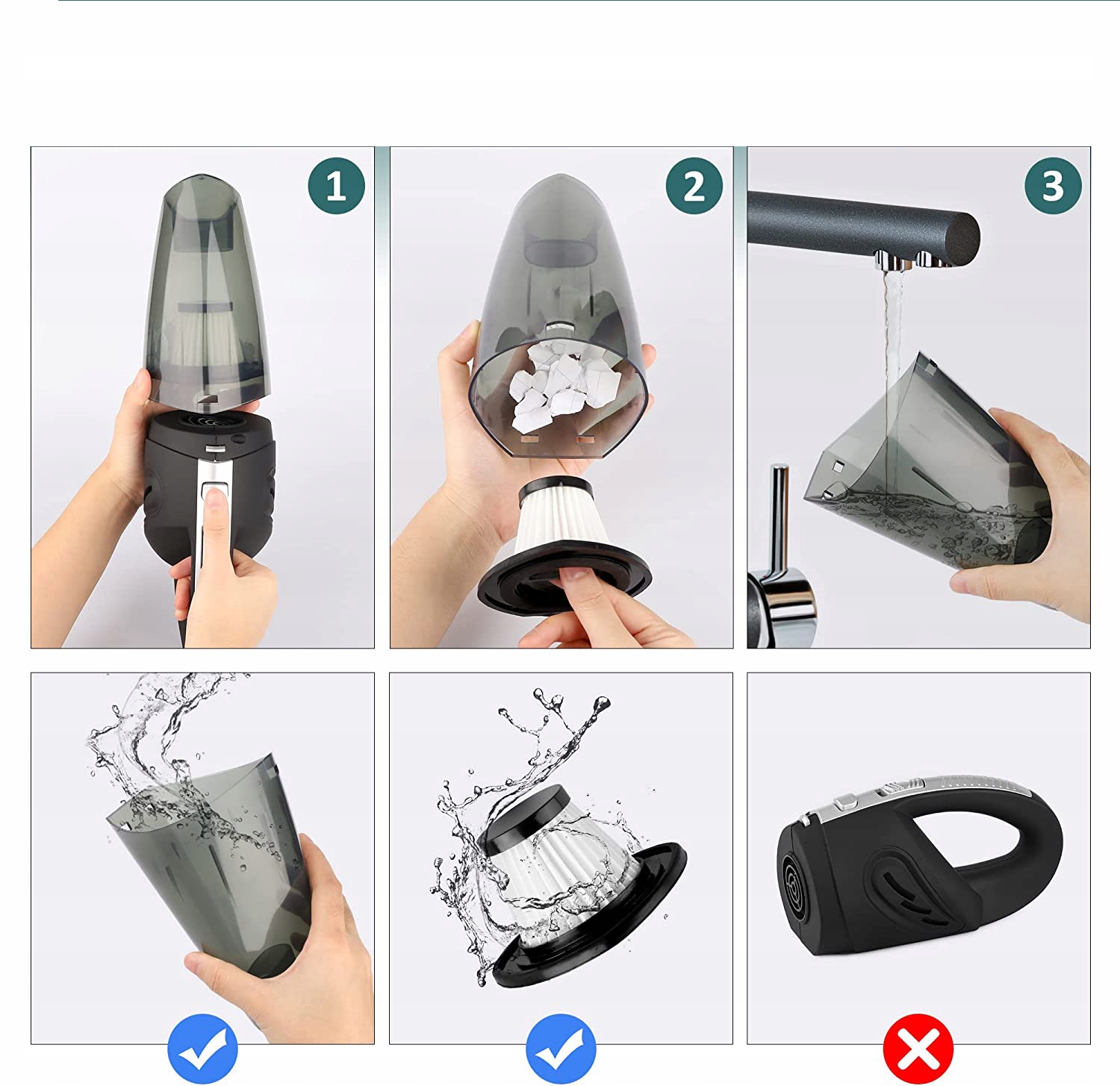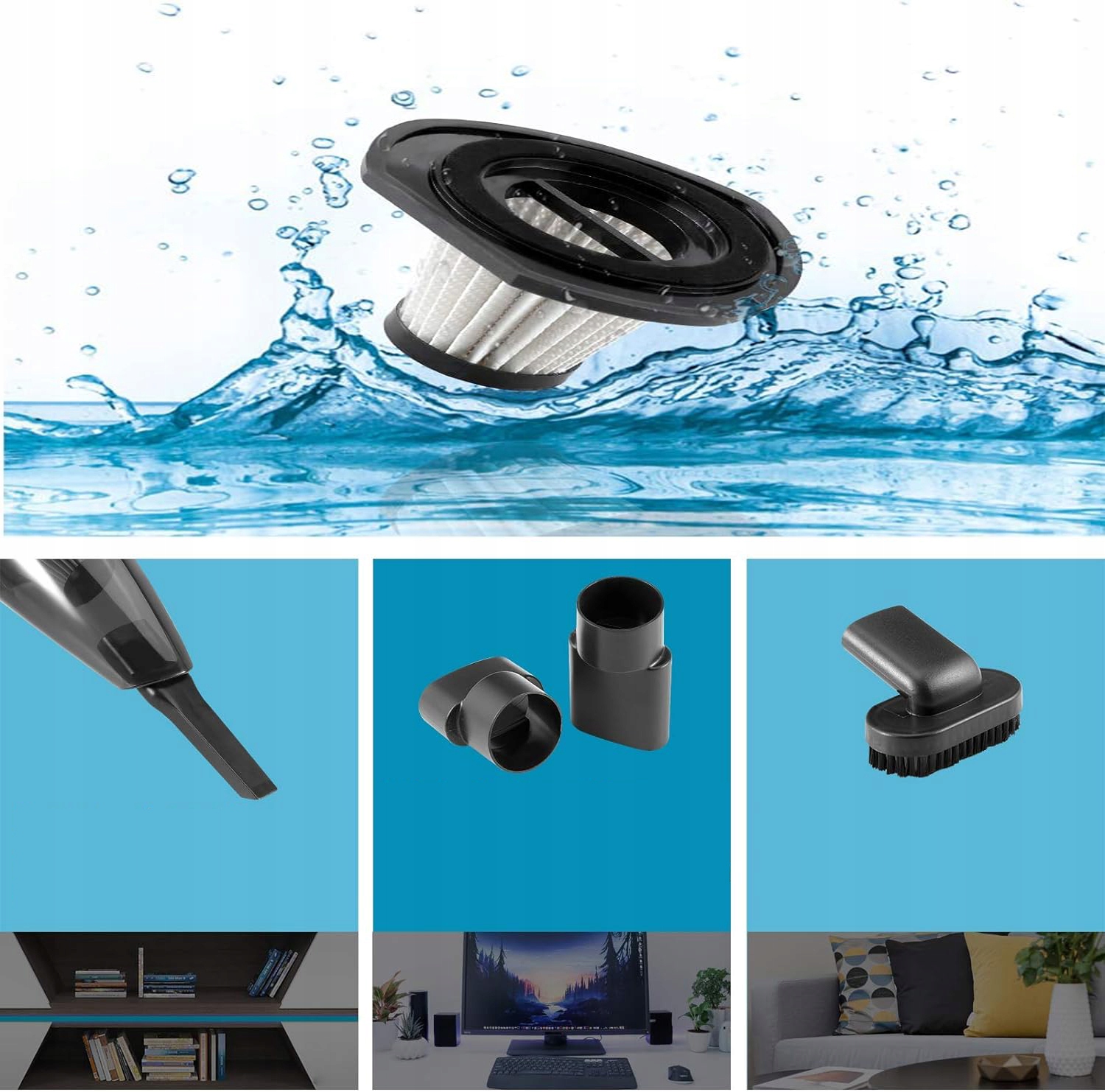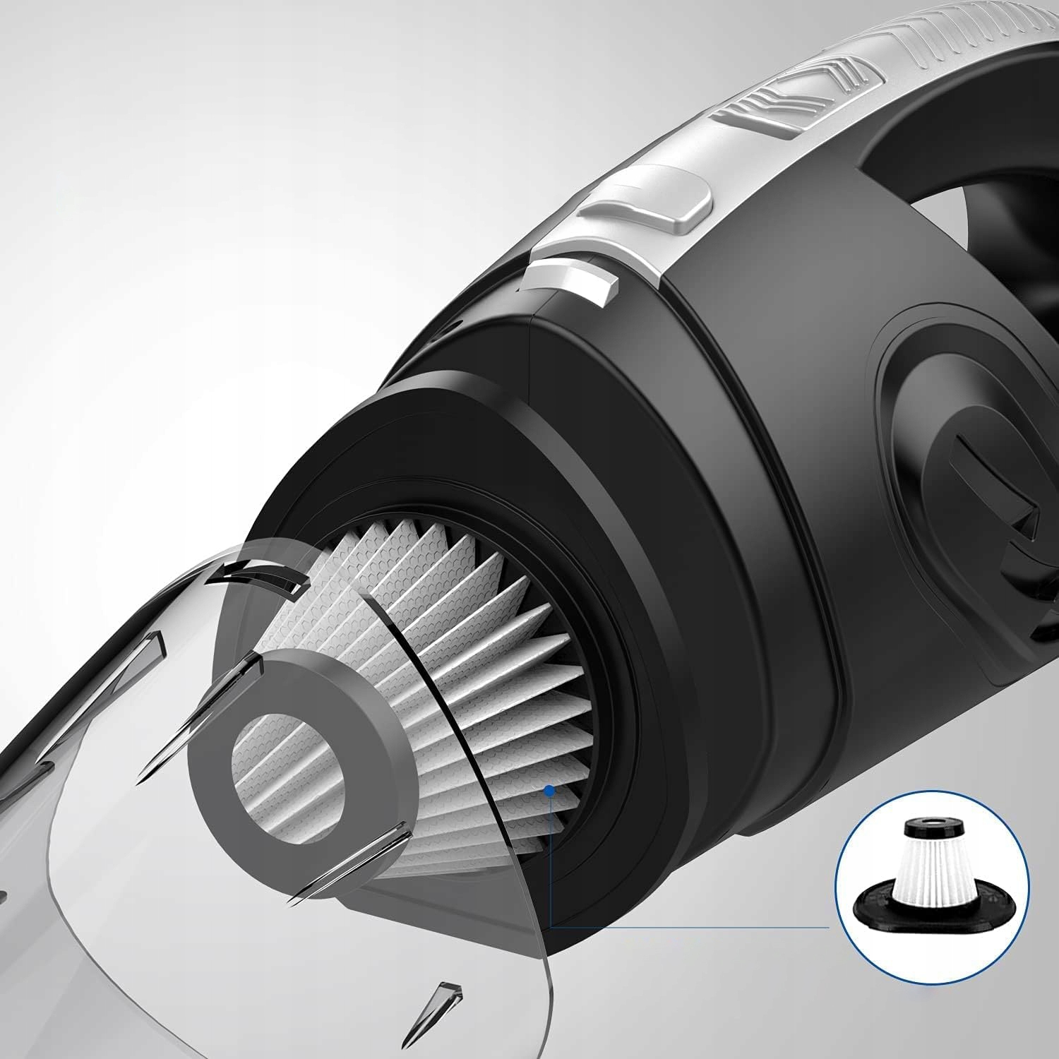 Ручний автомобільний пилосос оснащено вдосконаленим фільтром HEPA, у якому використовується високоякісний нейлоновий фільтр, який подовжує термін служби фільтра та ефективно запобігає потраплянню пилу в приводну частину, одночасно забезпечуючи чудову потужність всмоктування та продовжуючи термін служби пилососа. продукт.