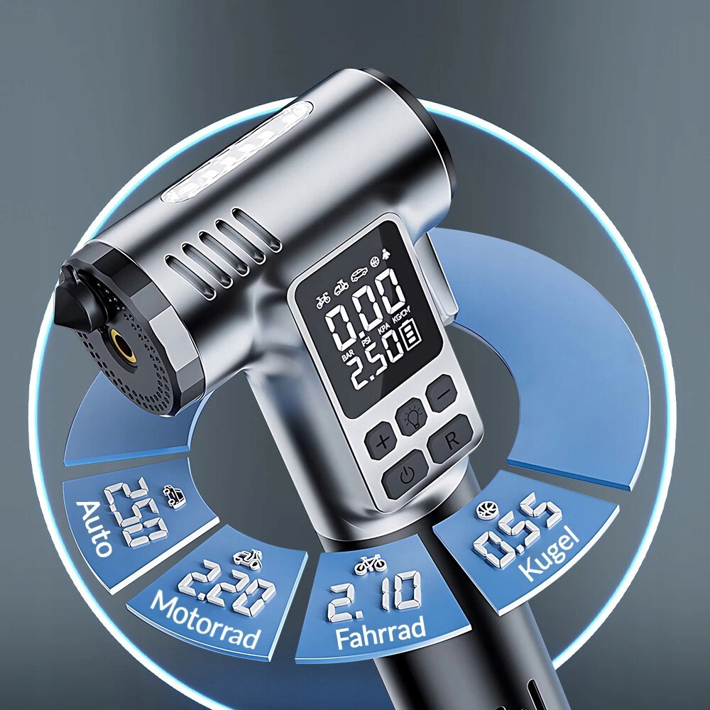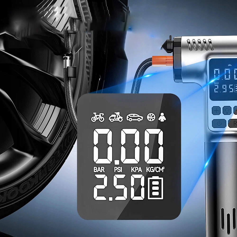 Розумний цифровий дисплей: попередньо встановлений тиск у шинах, автоматично зупиняється, коли шини заповнені. Ви можете вирішувати, скільки повітря заповнювати, не стежачи постійно за манометром у шині.