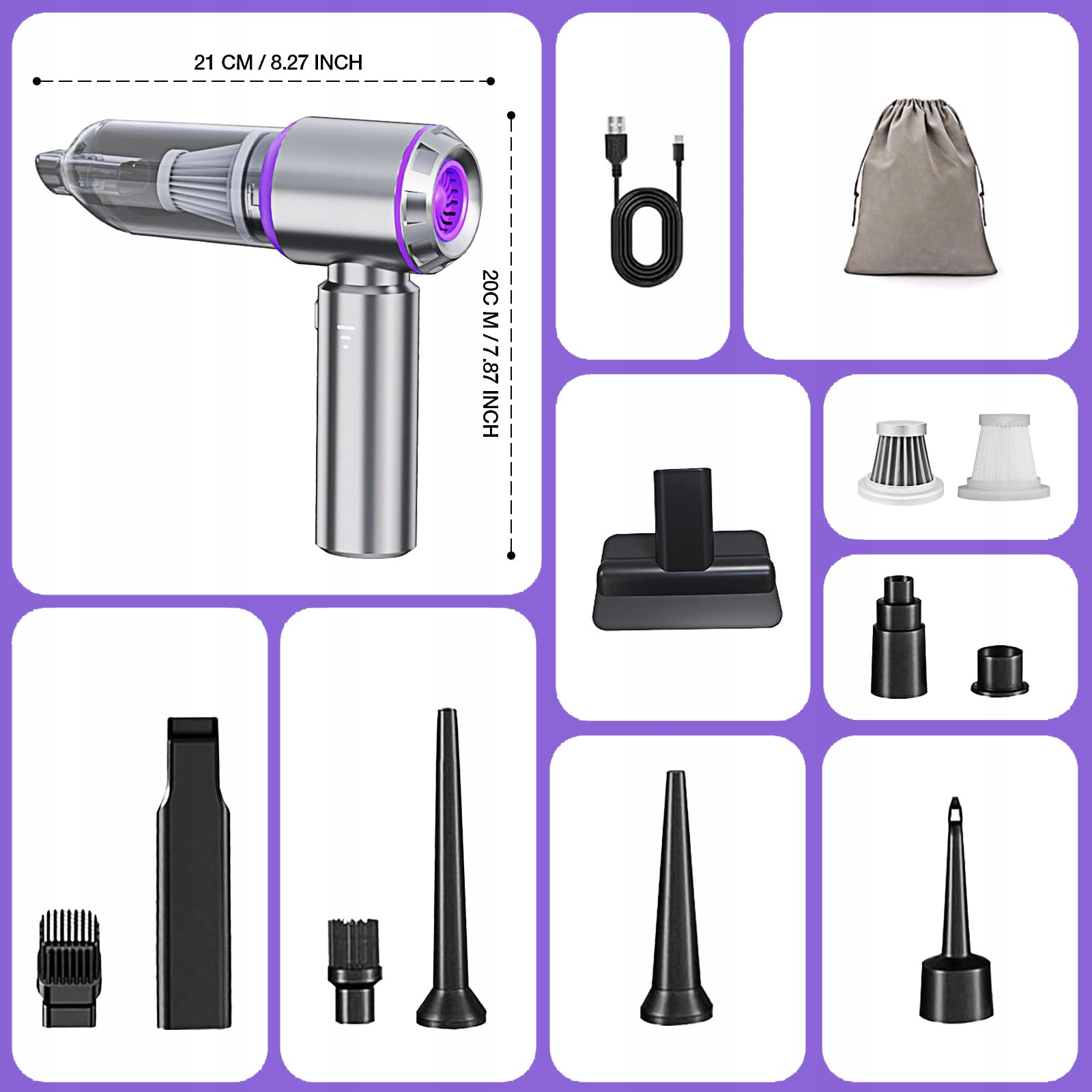 Цей акумуляторний автомобільний пилосос — це більше, ніж просто пилосос. Він поставляється з різними насадками, які дозволяють видувати, пилососити та надувати, що дозволяє виконувати різноманітні завдання з чищення та обслуговування. Численні аксесуари доступні для задоволення різноманітних потреб у видуванні, пилососі та всмоктуванні.