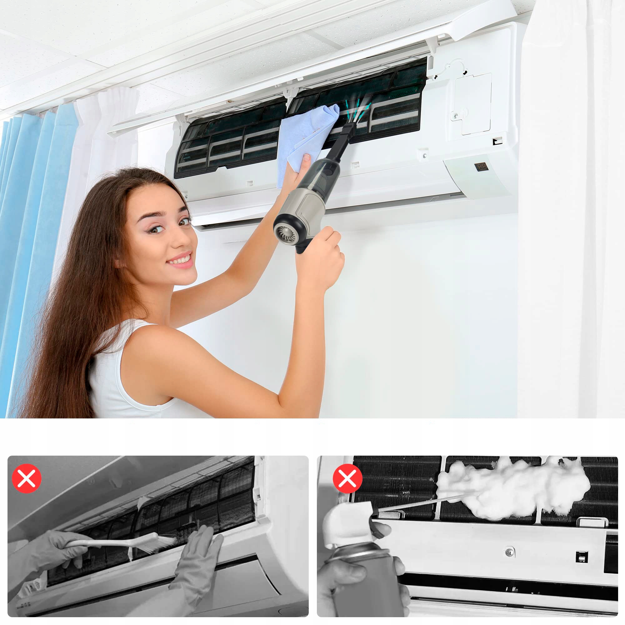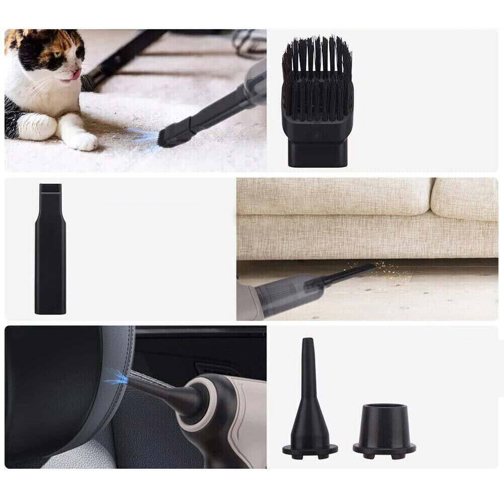 - Цей пилосос має функції всмоктування та видування, він не лише всмоктує пил, але й видуває пил одним кінцем з’єднання аксесуарів – це ефект пилососа, можливо, як пилосос, а інший кінець – функція повітродувки, можливо, як повітряний пилосос. З різними аксесуарами (4 всмоктувальні насадки, 2 * щітки).