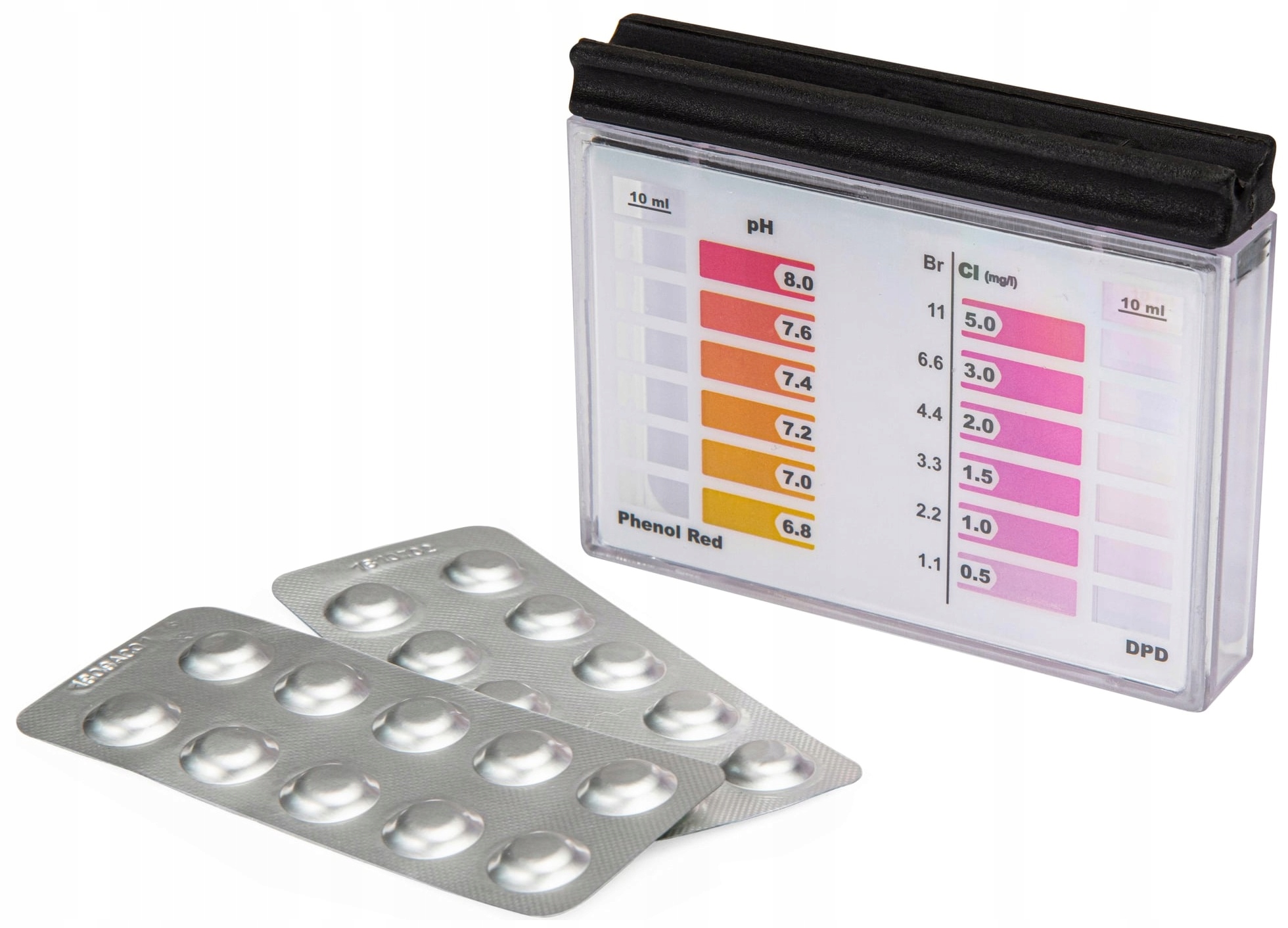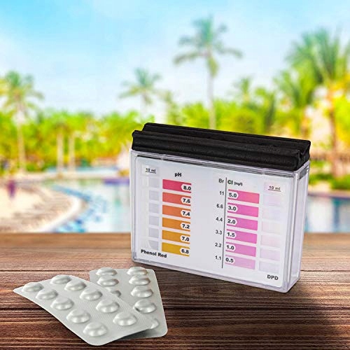 Тестер для води працює з тестовими планшетами. Наповніть тестер водою з басейну та додайте 2 тестові таблетки. Після цього вода знебарвлюється та надає інформацію про PH і значення хлору.