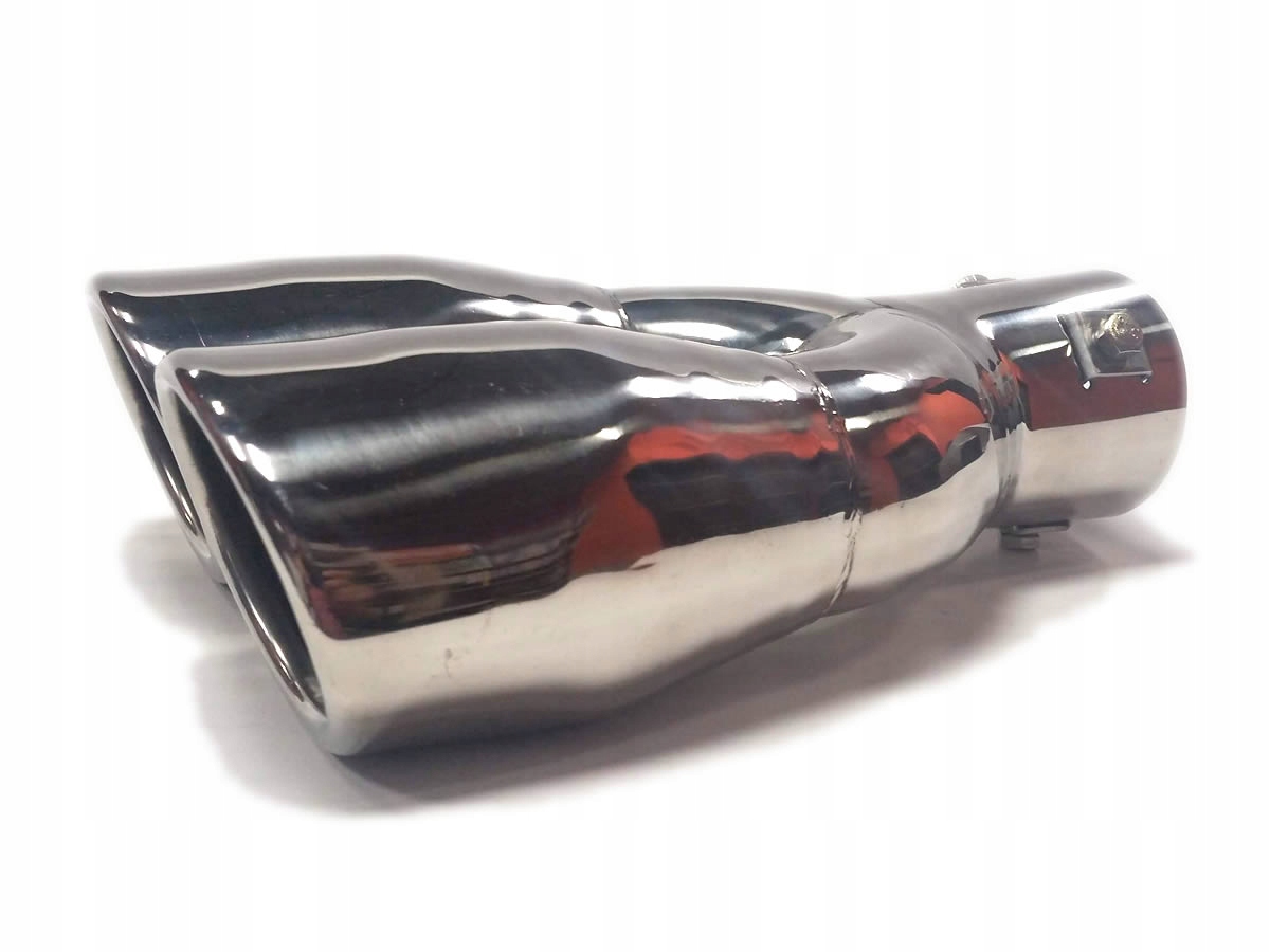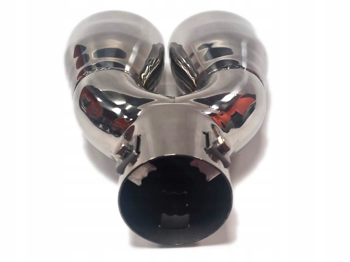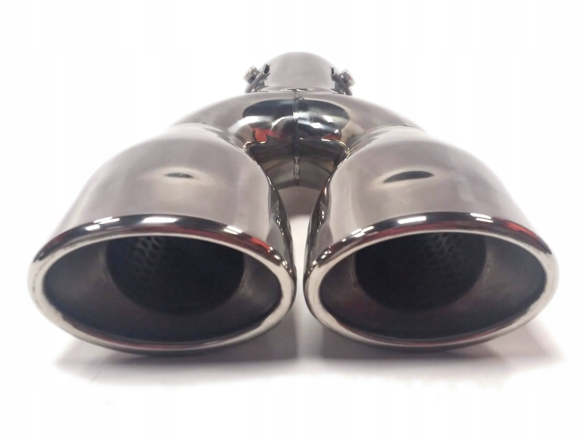 подвійний наконечник - овальний нахил, загорнутий всередину, упакований у гарну картонну коробку, виготовлений з нержавіючої сталі. У ньому є 3 затискачі, завдяки яким його установка дуже проста. Загальна довжина наконечника становить 230/115 мм (зверху/вниз), діаметр наконечника 86/67 мм, загальна ширина 175 мм, діаметр кріплення отвору 55 мм.