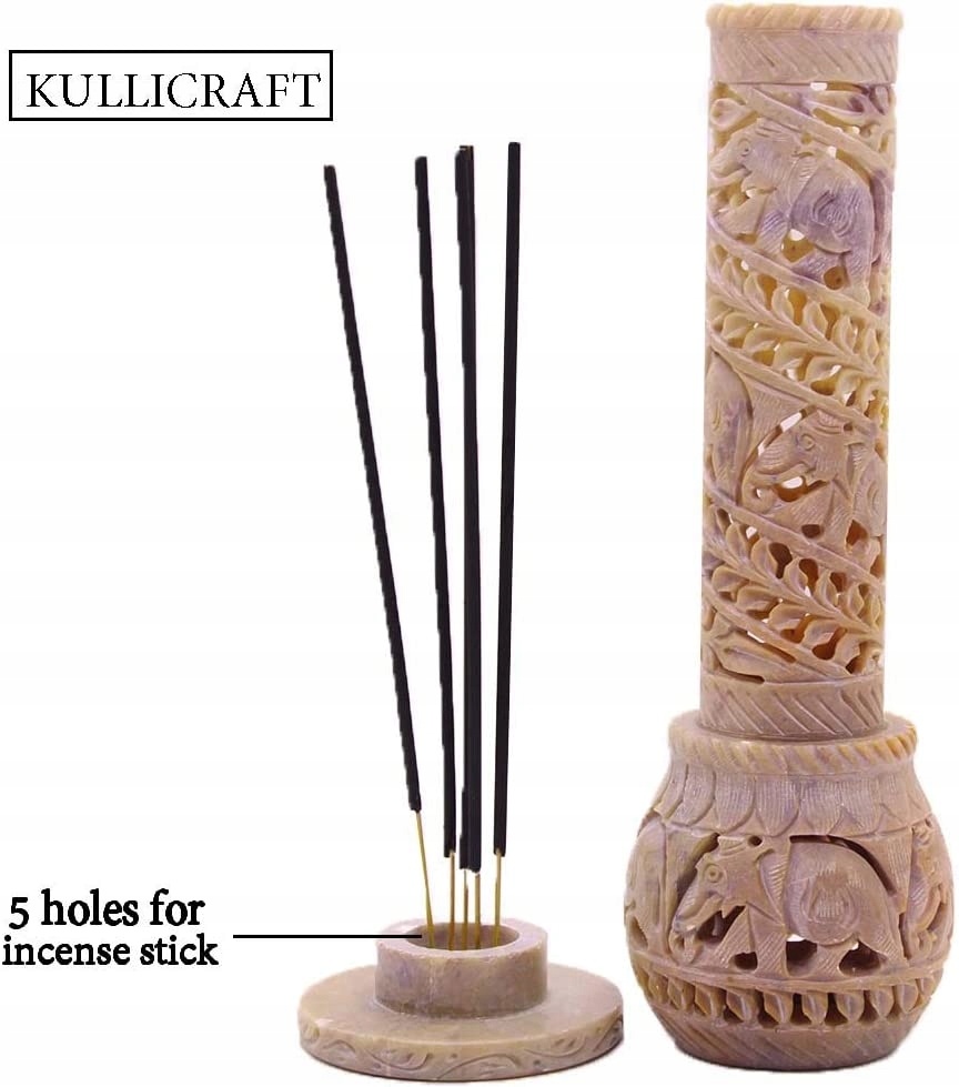 хитромудро рукоятка рукоятки для клавіші у формі пляшки, виготовленої зі стеатиту з багатьма отворами, щоб утримувати пахощі. Пальник тримає багато пахощів одночасно, і попіл красиво впаде в тарілку, щоб уникнути небажаного безладу. Ви можете насолоджуватися великим запахом пахощів. Крафти працюють наполегливо і невтомно протягом декількох днів, щоб вивести ідеально вирізані твори. Один поганий рух і відкриті роботи зламаються, і вам потрібно відкинути блок і почати все заново. Краса цих детальних, складних скульптурних робіт є причиною їх величезної популярності. Це прекрасний подарунок для близьких людей та привабливе доповнення до вашого будинку. Оскільки це продукт, виготовлений рукою, в камені немає двох скульптур.