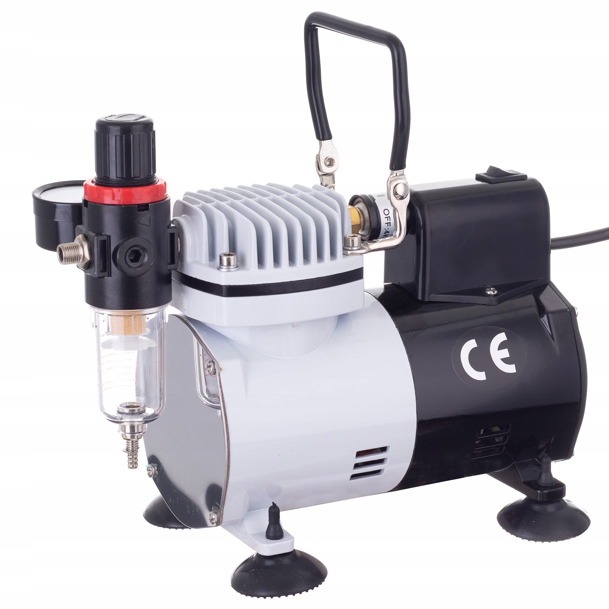 Безмасляний поршневий компресор для всіх типів аерографів, оснащений термовимикачем. Використовується в салонах краси, татуюванні, найчастіше в моделюванні та невеликих малярних роботах.