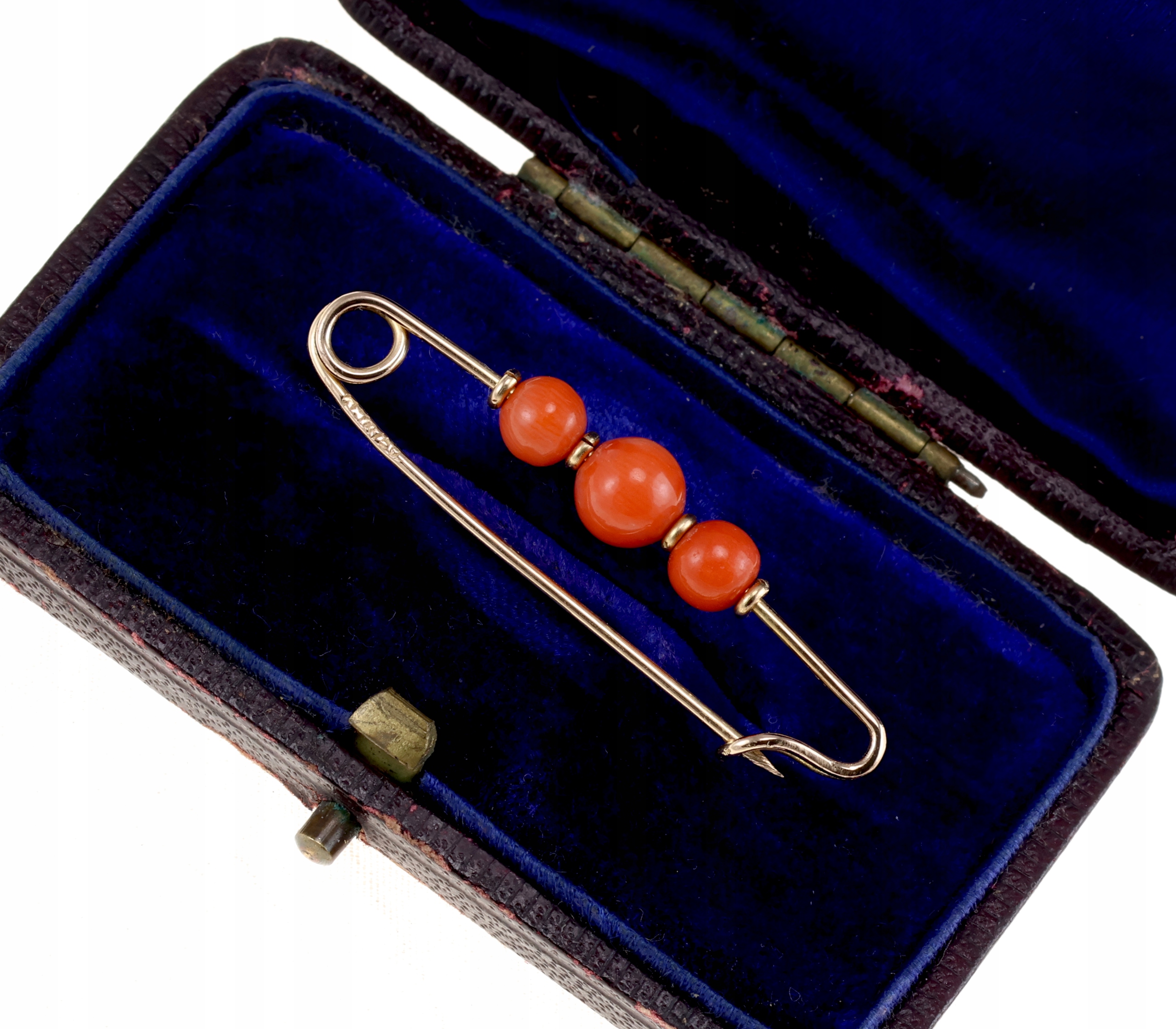 Предмет продажу брошка з вищого золота 18К у вигляді безпеки шпилька. Брошка прикрашена трьома натуральними коралами. Проста та елегантна прикраса.