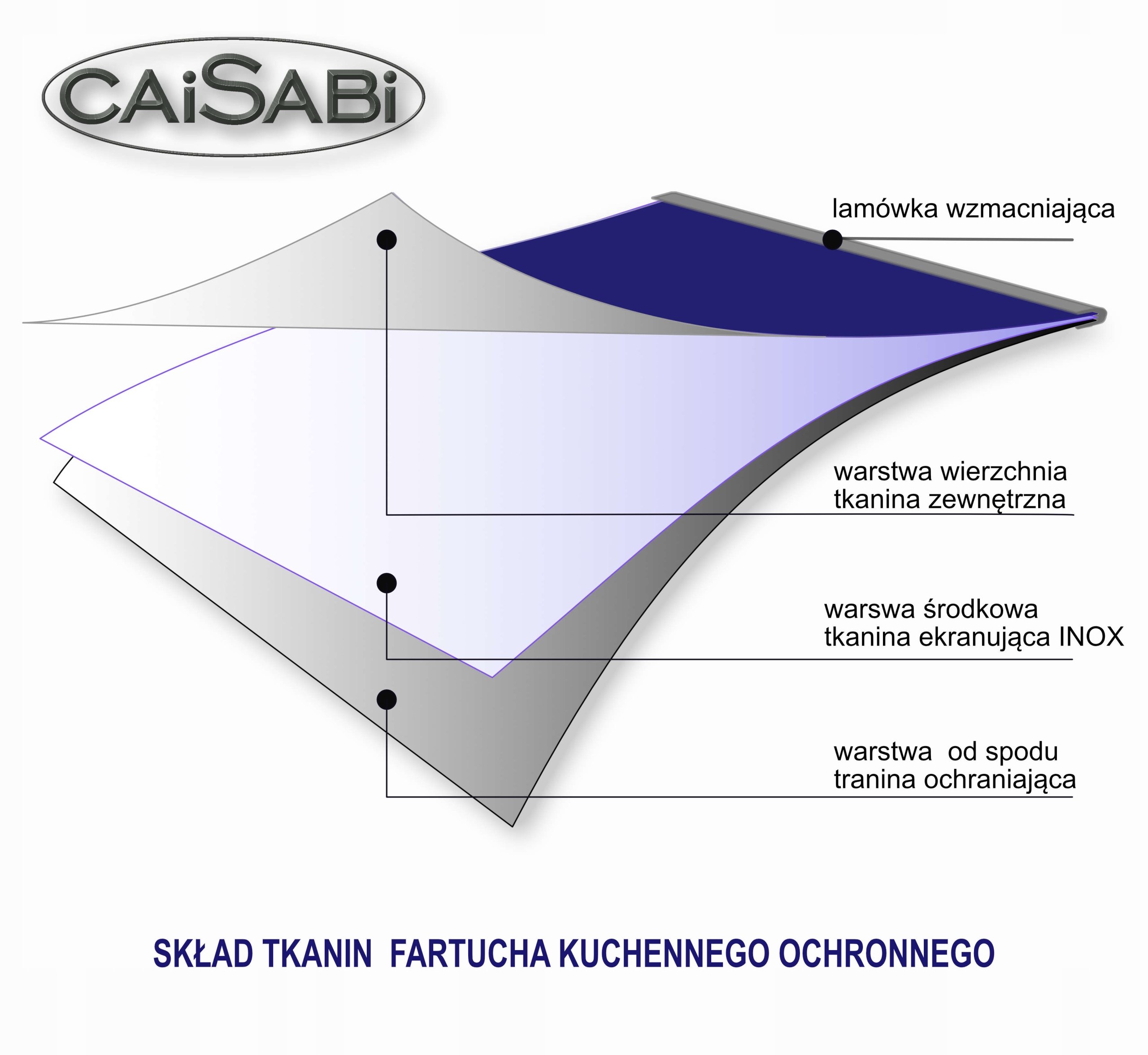 Для виготовлення фартуха було використано три шари тканини. Зовнішній шар - естетичний 100% поліестер, всередині - екрануюча тканина з волокнами INOX, яка не пропускає електромагнітне випромінювання в діапазоні 700 МГц -99%, 3,4-3,8 ГГц -92% і для 27 ГГц -10%.