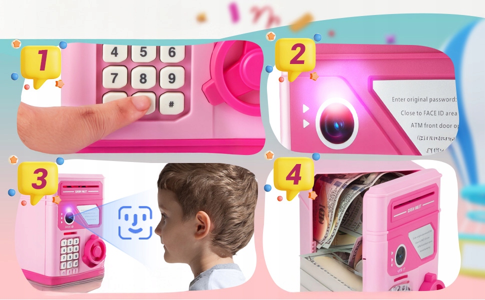 Ця скарбничка банкомату захищена паролем і імітує розпізнавання обличчя для додаткової безпеки. Просто введіть 3-значний код і піднесіть обличчя до миготливого синього вогника, щоб розблокувати дитячий сейф. Це цікавий і високотехнологічний спосіб зберегти їхні скарби в безпеці!