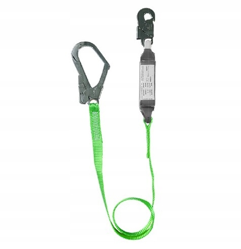 - Амортизатор, призначений для використання з індивідуальним обладнанням для захисту від падіння. Це важливий компонент системи захисту від падіння, що складається з: ременя безпеки, амортизатора, з’єднувальних і кріпильних елементів. Виготовляється з поліамідної стрічки шириною 44 мм. оброблені кріпильними петлями; складається в пакет і покривається термозбіжною плівкою. Кінці амортизаційного блоку оброблені двохраповими карабінами з автоматичним замиканням, виготовленими з високоякісної сталі, що відповідають стандарту EN 362. З боку кабелю карабін має ширину отвору 53 мм; до амортизатора кріпиться карабін з шириною отвору 17 мм. Ця система амортизації сертифікована відповідно до стандарту EN 355 і в цілому має статичну навантажувальну здатність 15 кН.