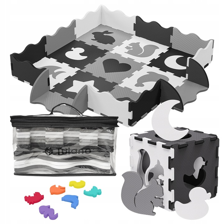- ⭐Набір XXL : 9 основних пазлів, 12 сторін, 4 кути, 9 частин пазла - знімні форми, 6 тварин для купання та сумка для зберігання