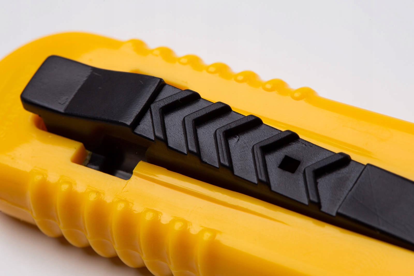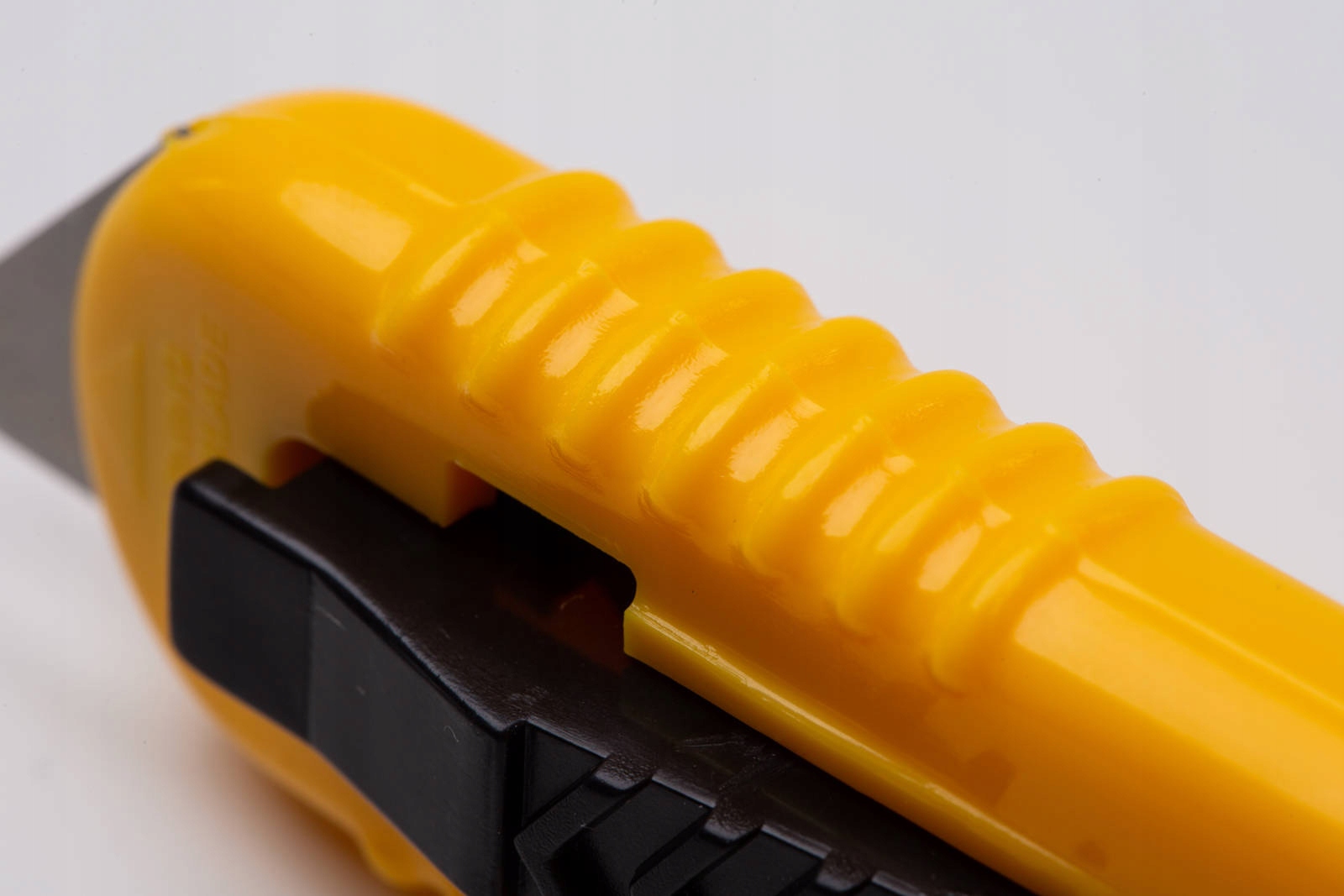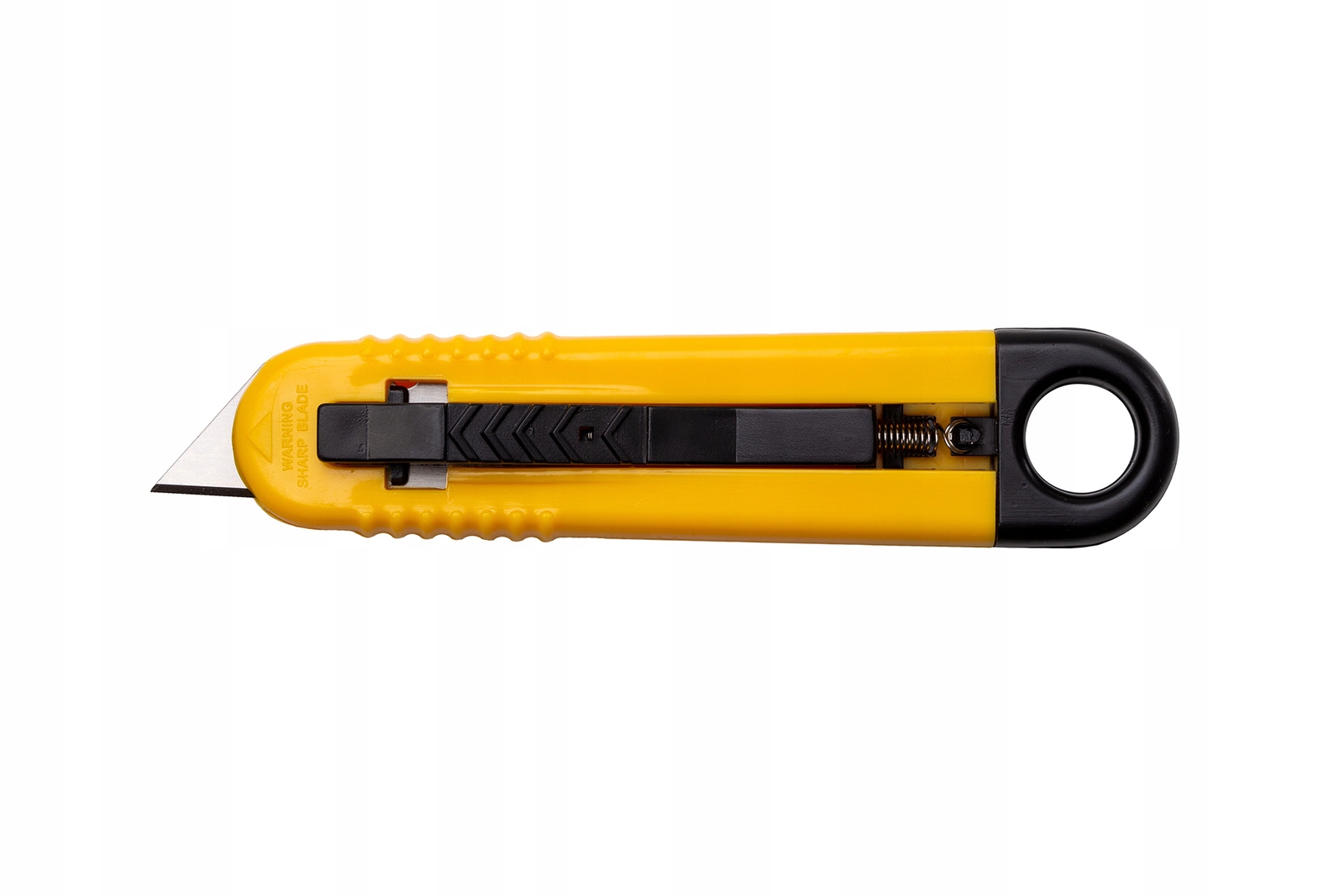 компактний ніж, який добре в руці. Корпус виготовлений з хорошої якості пластику, маючи вкладки для кращого зчеплення. Нож має класичний пружинний механізм. Це означає, що користувач повинен пам’ятати про випуск повзунка під час різання, щоб лезо повертався до ручки. Трапецієподібне лезо використовується двічі, заміна робиться без додаткових інструментів. Крім того, ми можемо використовувати лезо з закругленими кінцями для підвищення безпеки. Ліві -люди, що перебувають у формі, також можуть працювати з цим ножем. Ручка закінчена оком на повідку. Жовтий колір корпусу робить ніж легко помітним у рівномірних промислових кімнатах.